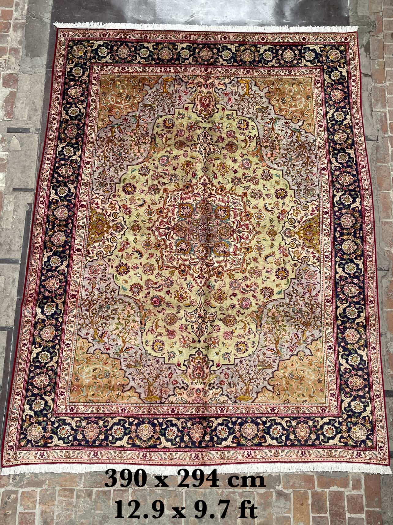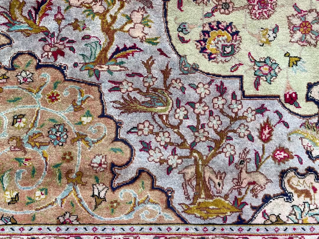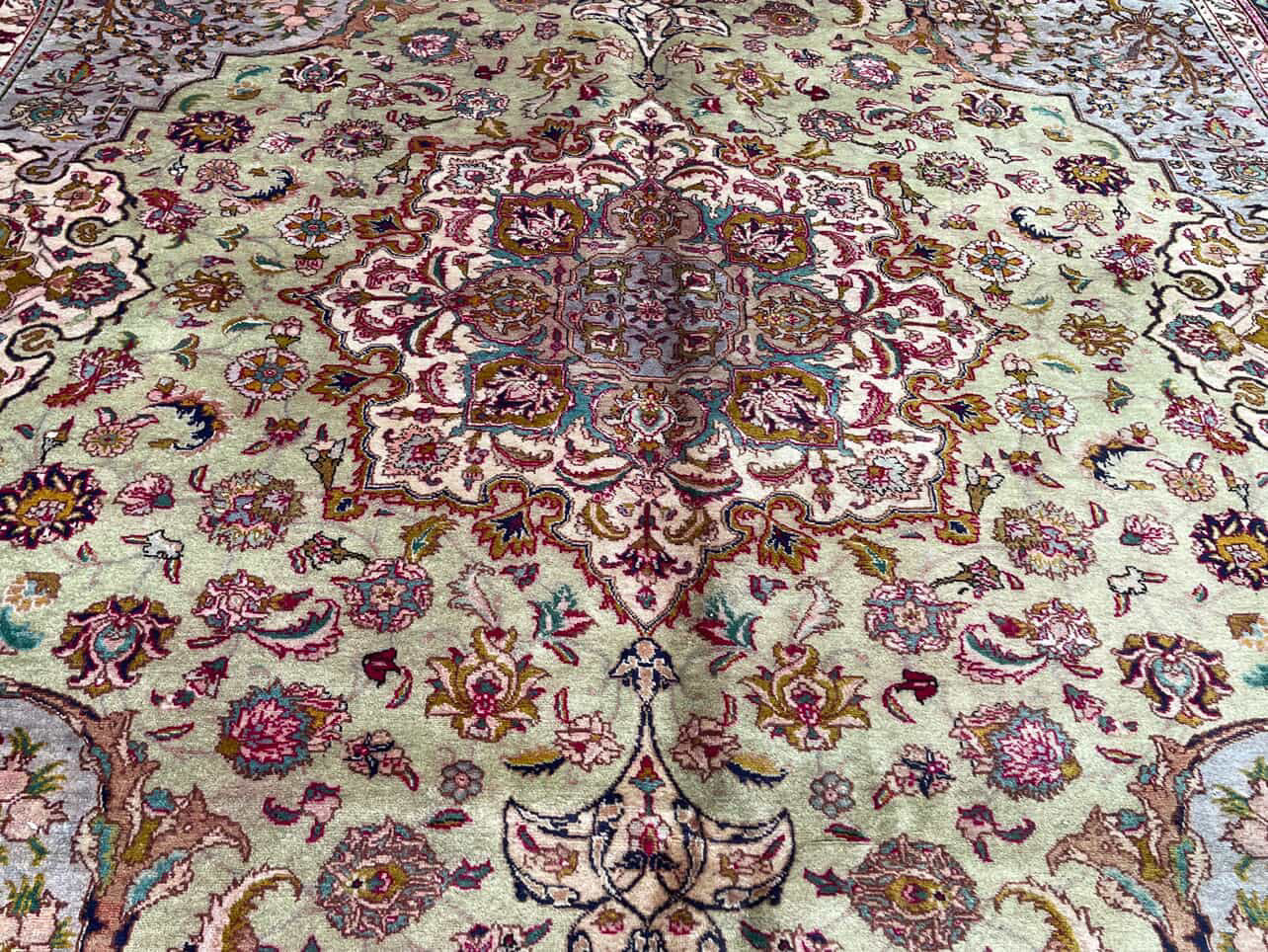Eloise is a beautiful Tabriz rug and is hand knotted and woven from wool. She has a low pile, that is easy to clean up but is still soft underfoot. This rug measures approximately 10x13 at the widest bulge and has a very pretty palette of red, with green and pink accents. She carries the traditional flower design.