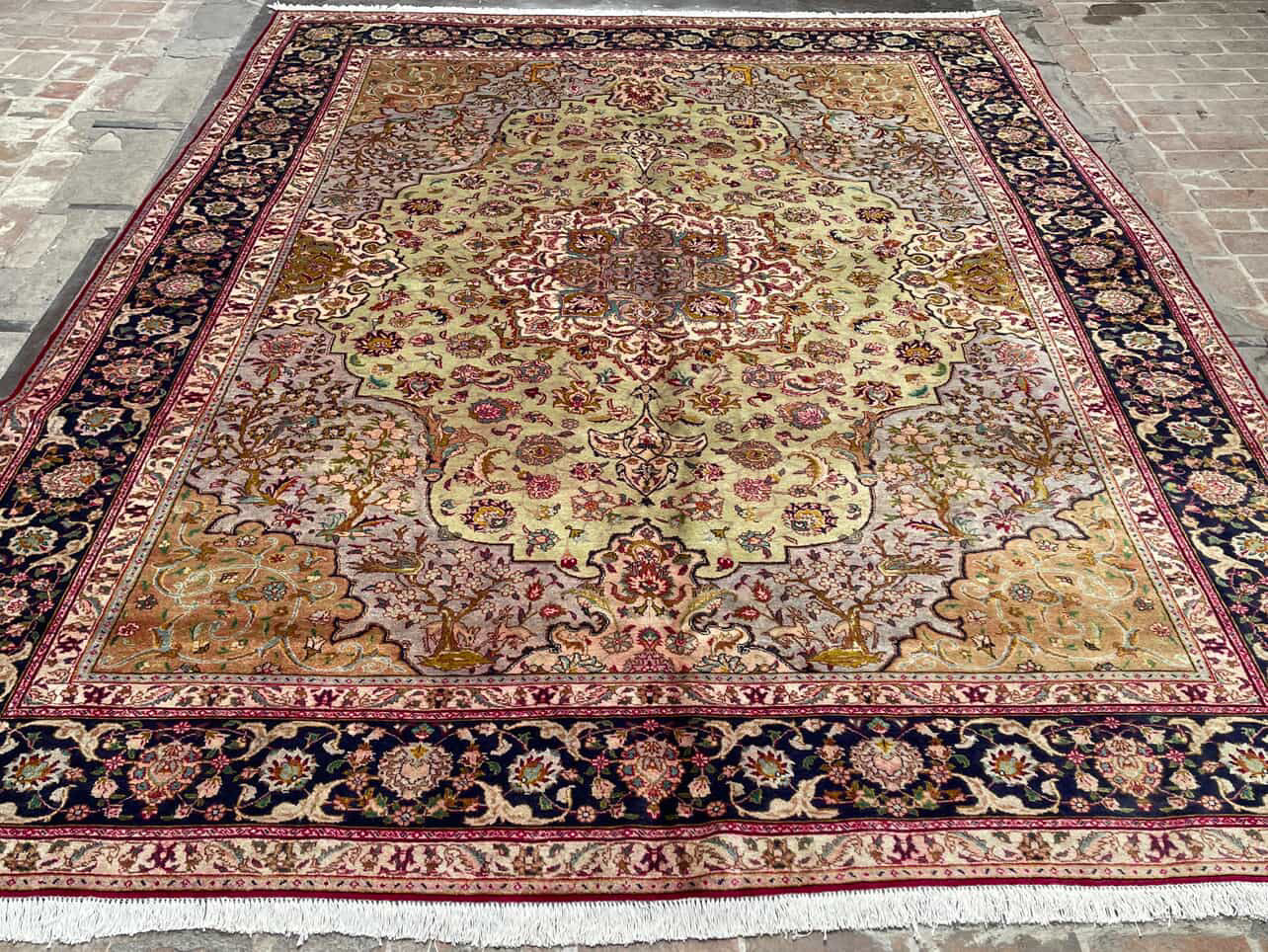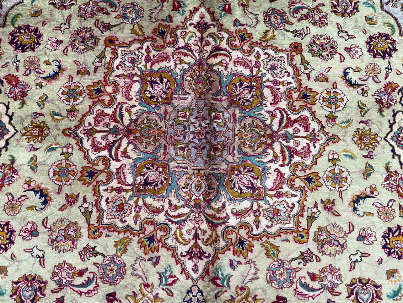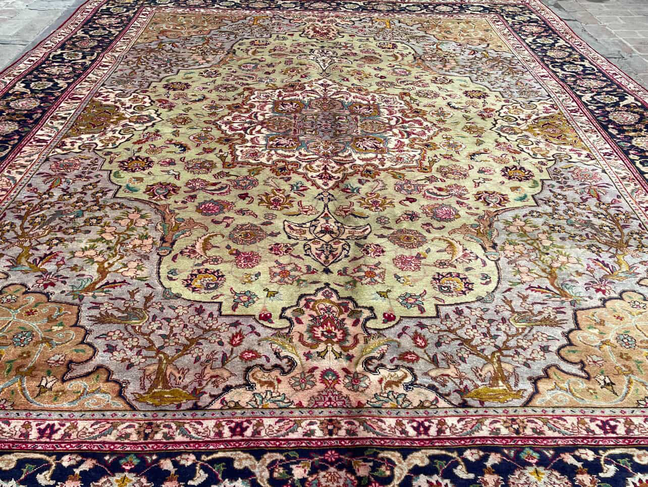 Eloise is a beautiful Tabriz rug and is hand knotted and woven from wool. She has a low pile, that is easy to clean up but is still soft underfoot. This rug measures approximately 10x13 at the widest bulge and has a very pretty palette of red, with green and pink accents. She carries the traditional flower design.