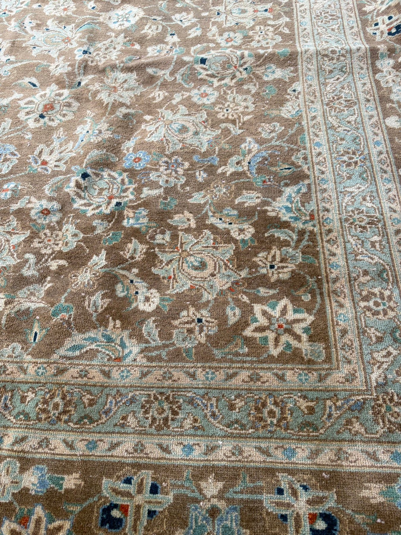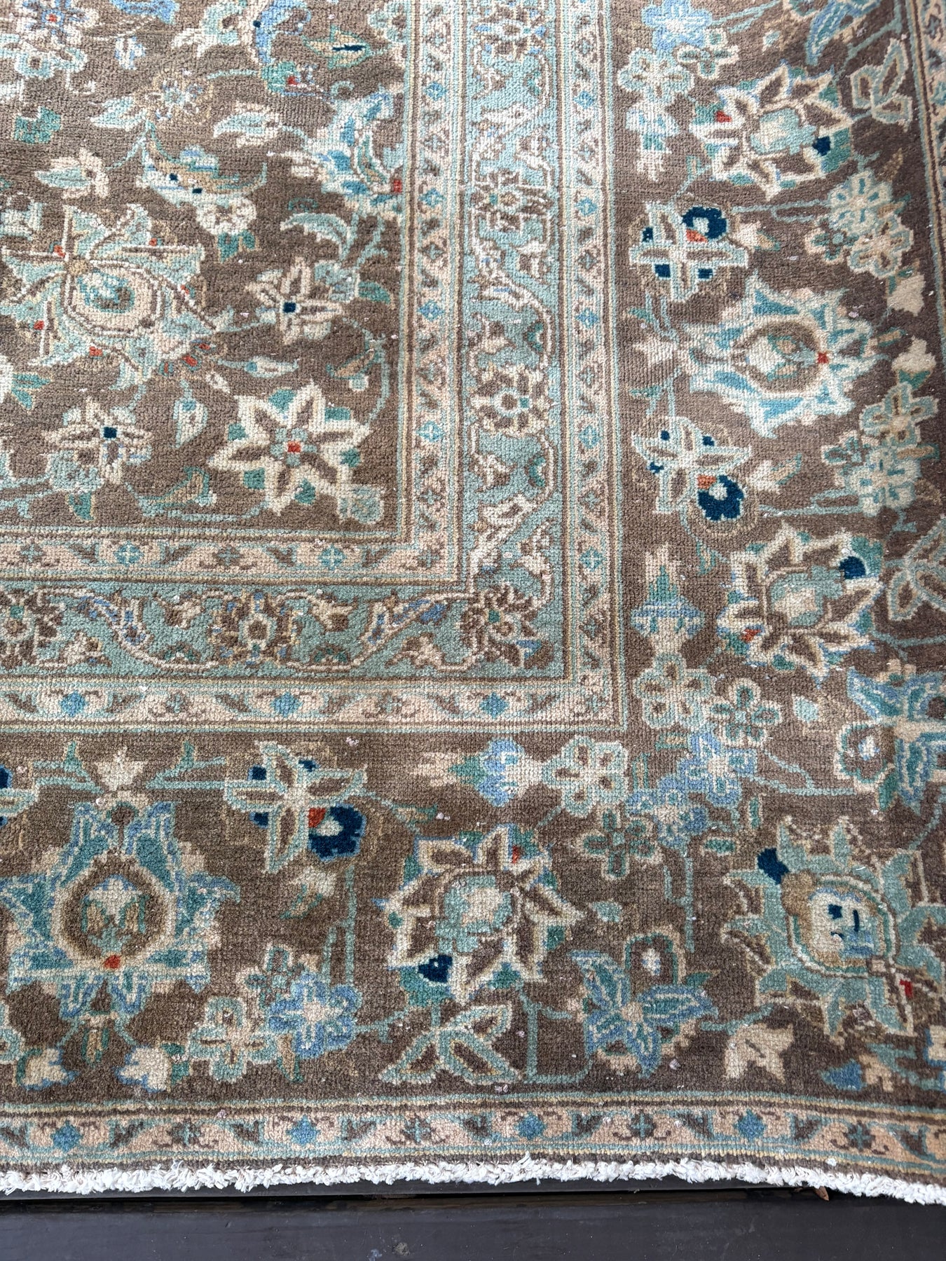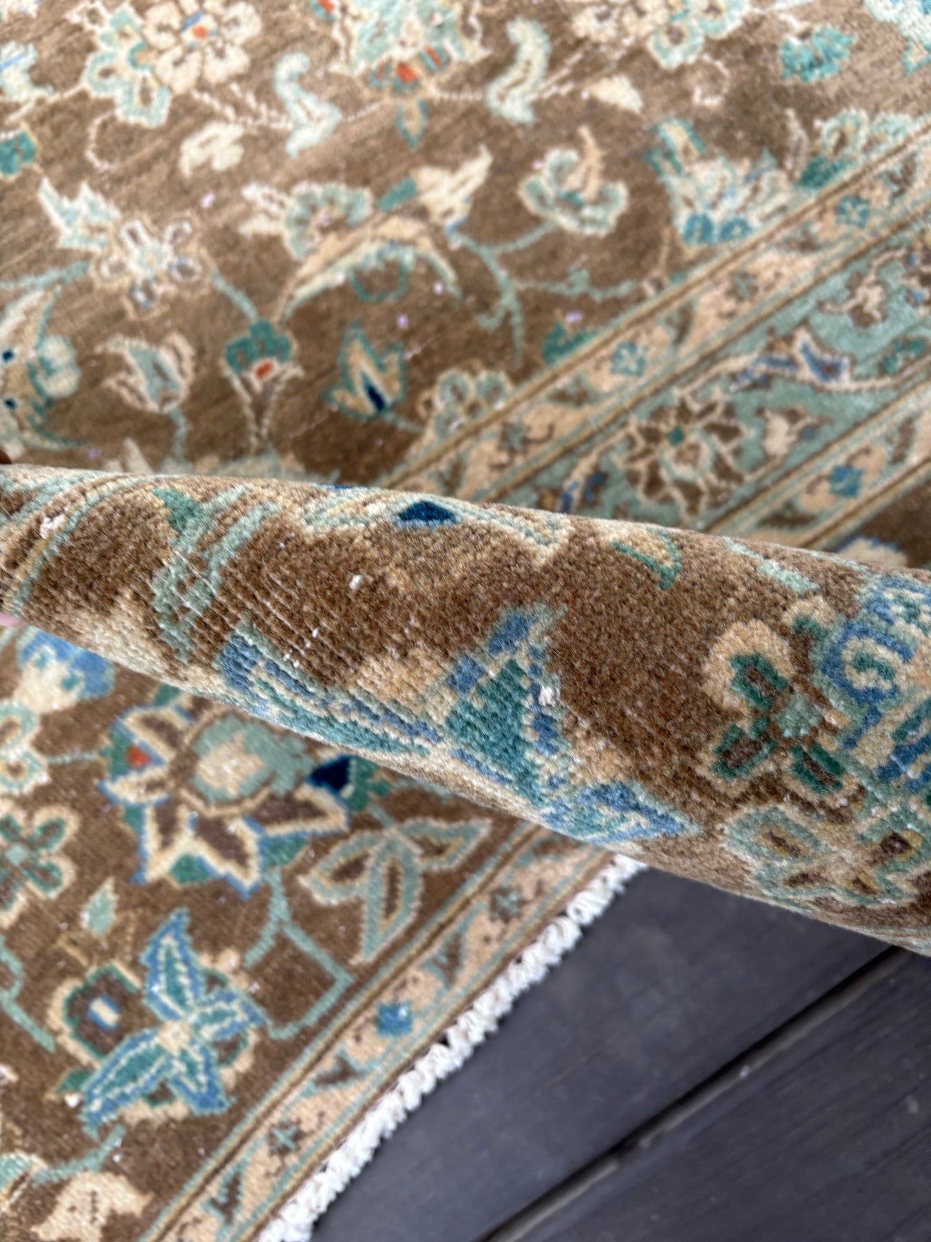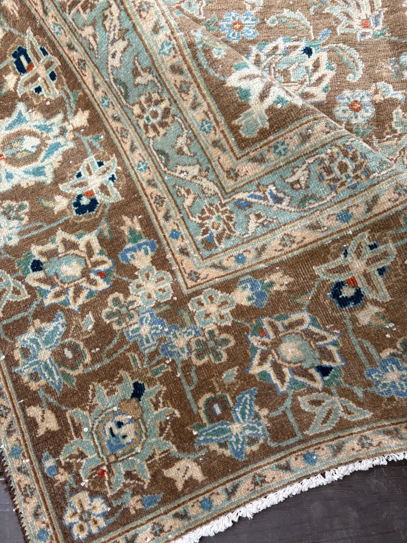 Misty is a beautiful persian Tabriz rug and is hand knotted and woven from wool. She has a low pile, that is easy to clean up but is still soft underfoot. This rug measures approximately 9’2x12’3 at the widest bulge and has a very pretty palette of navy, aqua blue with brown and robins egg blue accents. She carries the traditional flower design.