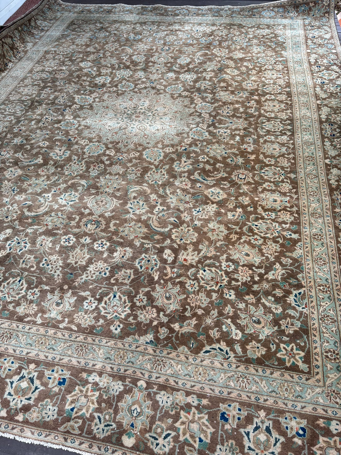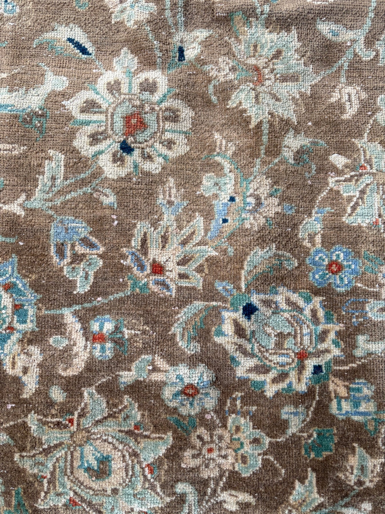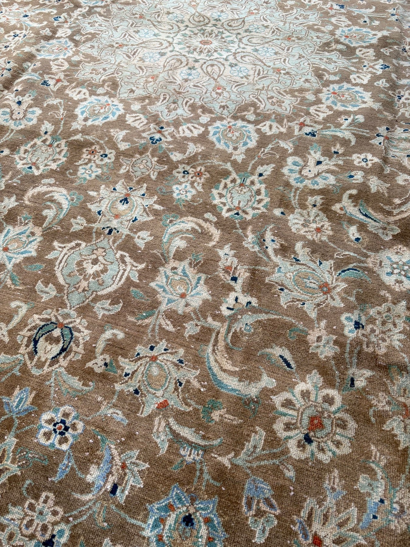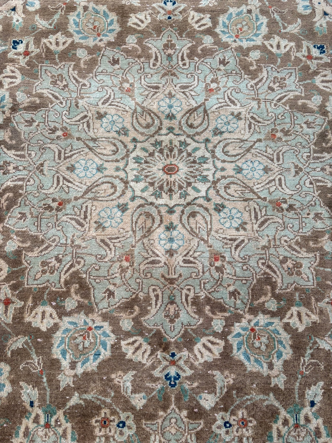 Misty is a beautiful persian Tabriz rug and is hand knotted and woven from wool. She has a low pile, that is easy to clean up but is still soft underfoot. This rug measures approximately 9’2x12’3 at the widest bulge and has a very pretty palette of navy, aqua blue with brown and robins egg blue accents. She carries the traditional flower design.