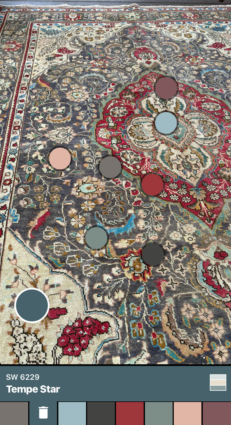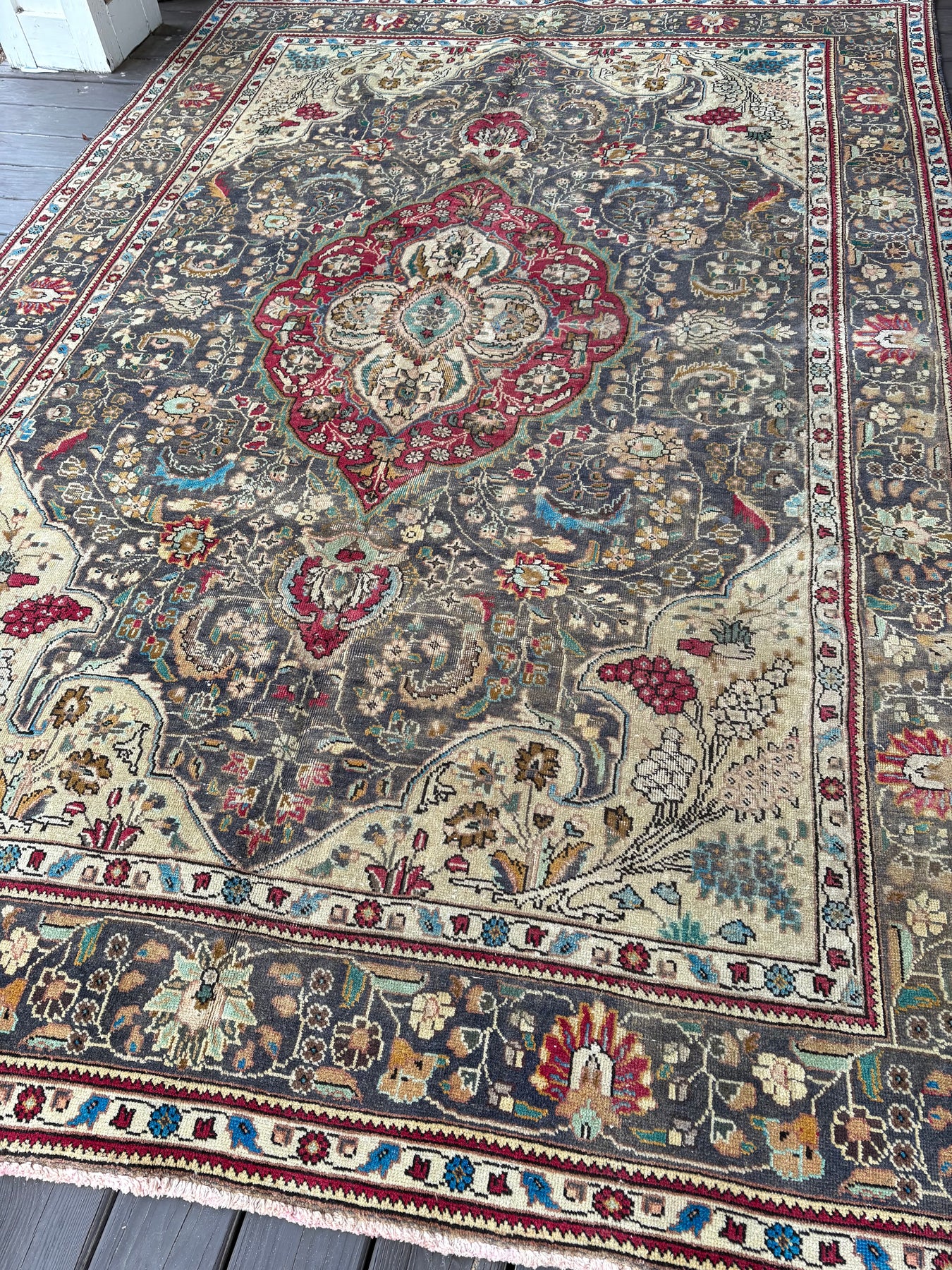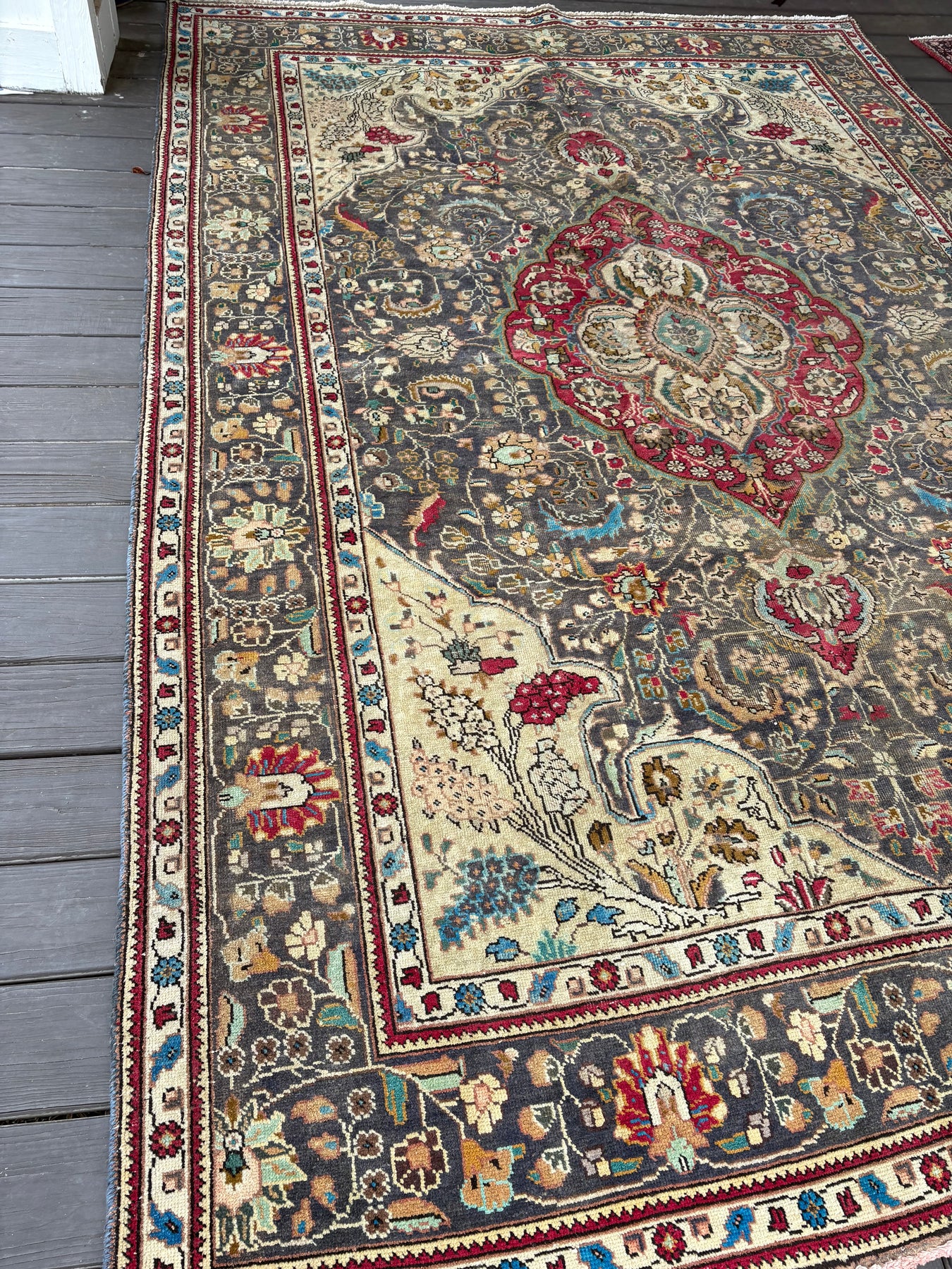 Gwendolyn is a beautiful persian Tabriz rug and is hand knotted and woven from wool. She has a low pile, that is easy to clean up but is still soft underfoot. This rug measures approximately 6’8x9’10 at the widest bulge and has a very pretty palette of grey/black, with turquoise, red and pink accents. She carries the traditional flower and medallion design.