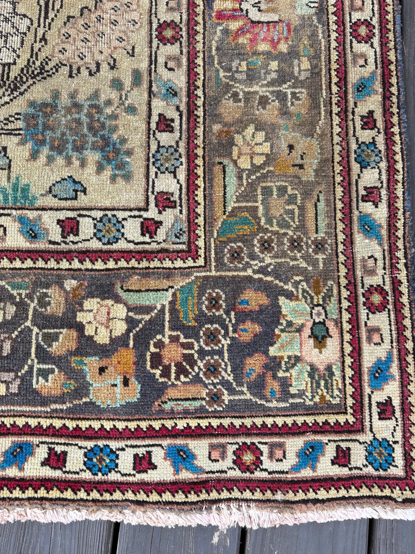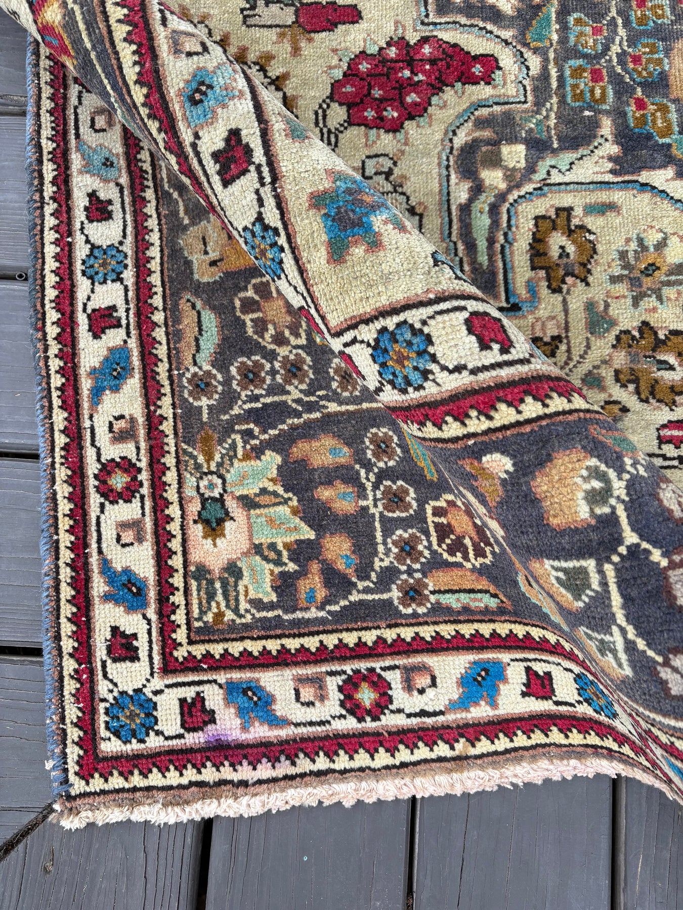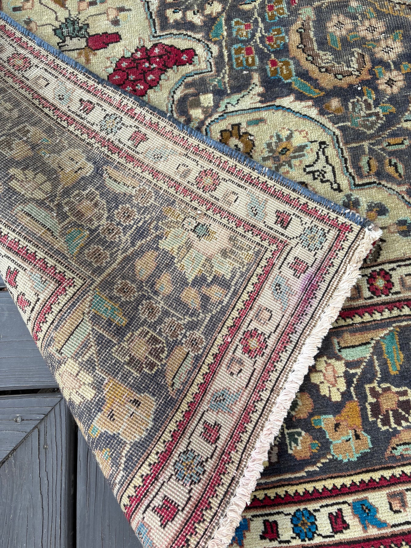 This rug is vintage. Please refer to photos for condition. We do our best to photograph these rugs in natural and artificial light but colors may appear different from what is shown on your screen. All of our rugs and pillows are vintage and/or antique. Due to their hand made nature and age, rugs may show discrepancies such as, repairs, tears, holes, wear, fading, discoloration, odor etc. We respect the character and history of our textiles, and do not consider these defects.