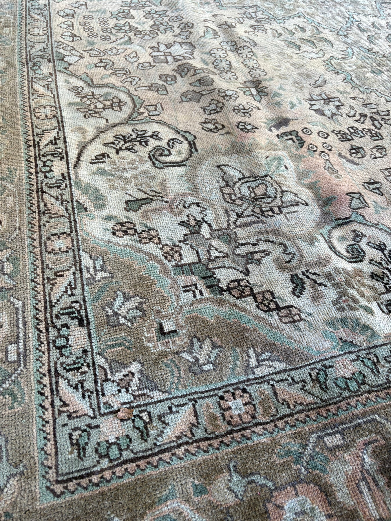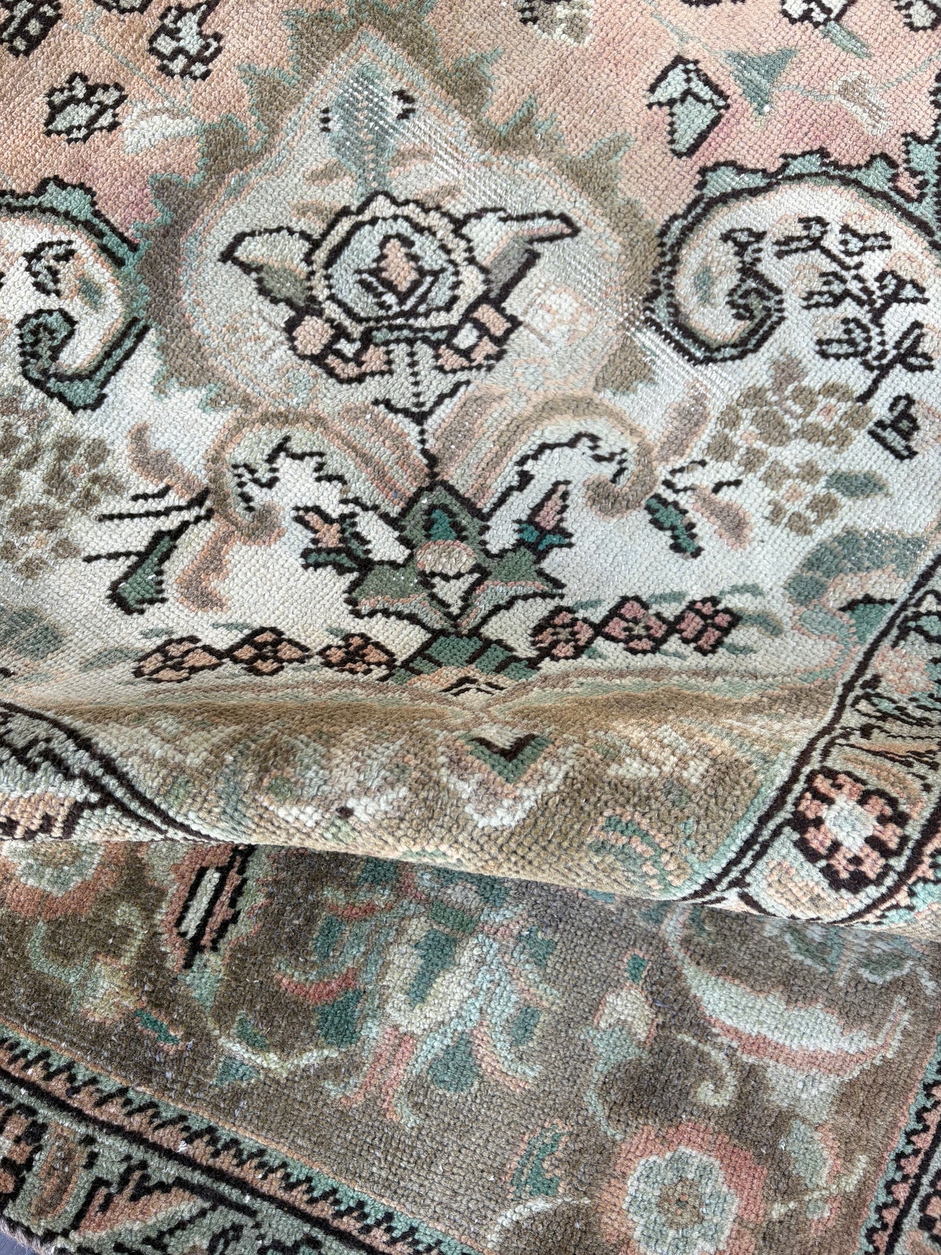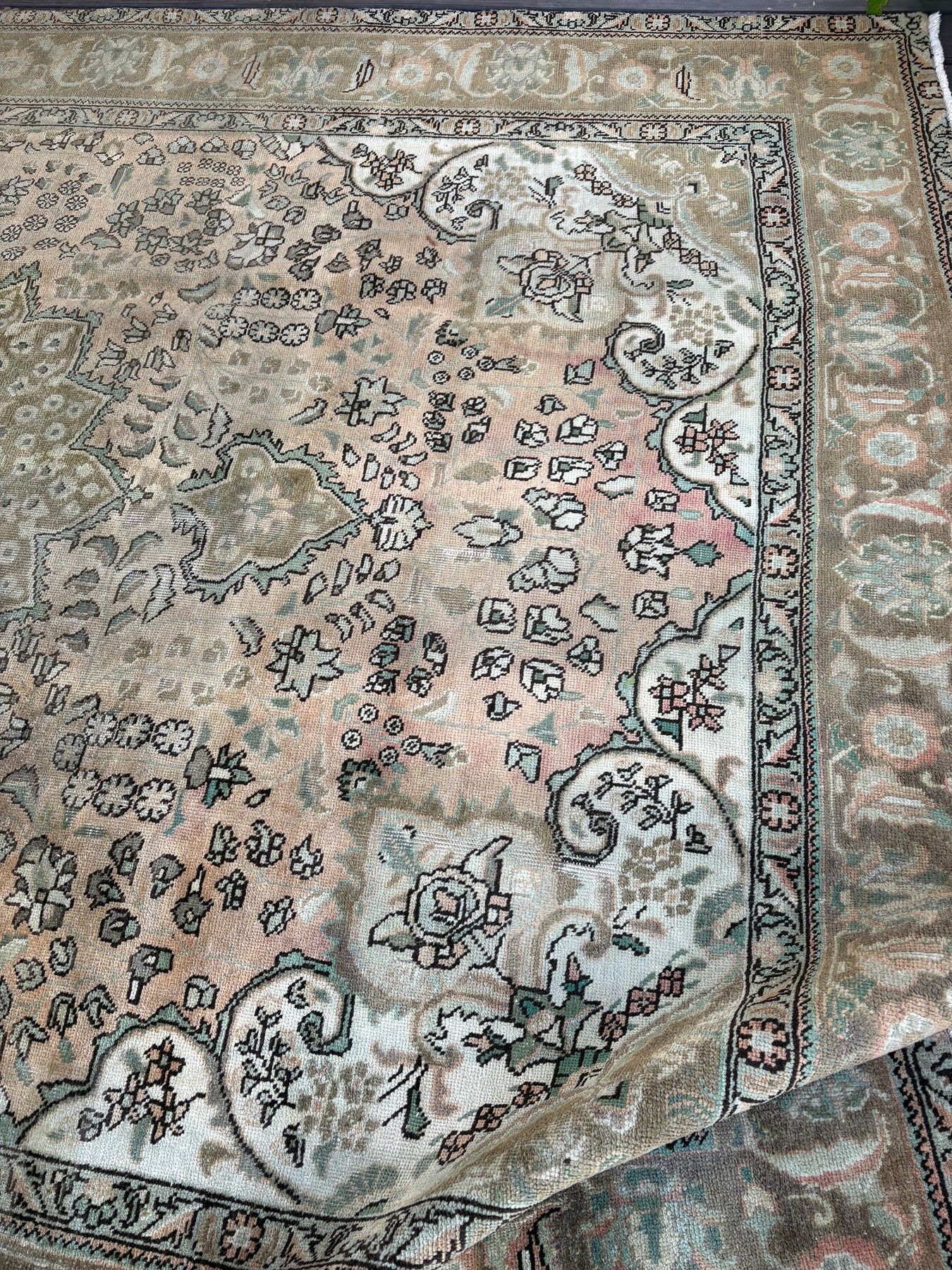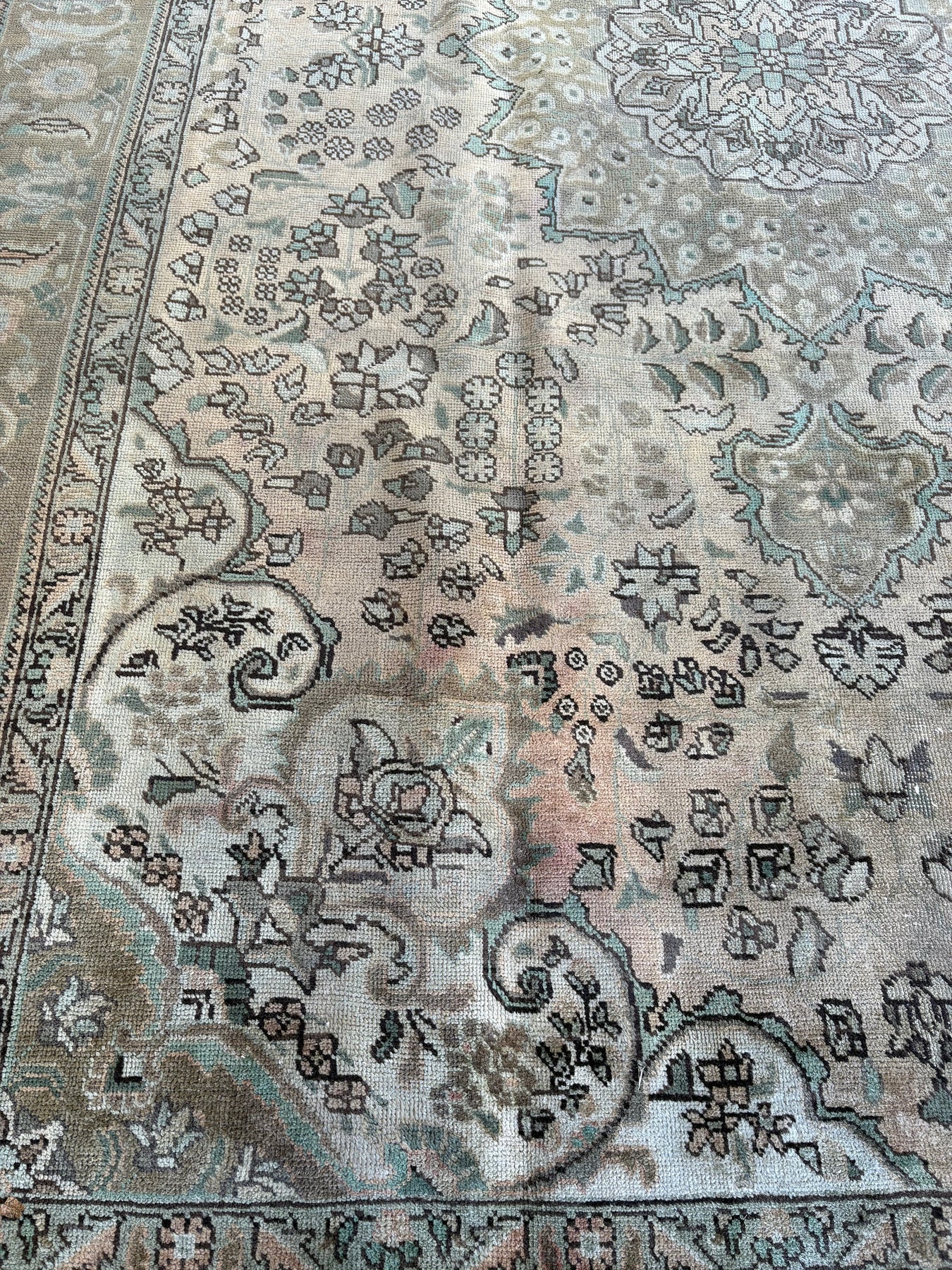 Seraphina is a beautiful persian Tabriz rug and is hand knotted and woven from wool. She has a low pile, that is easy to clean up but is still soft underfoot. This rug measures approximately 8x11’8 at the widest bulge and has a very pretty palette of peach, with sea foam green and brown, gray accents. She carries the traditional diamond design.