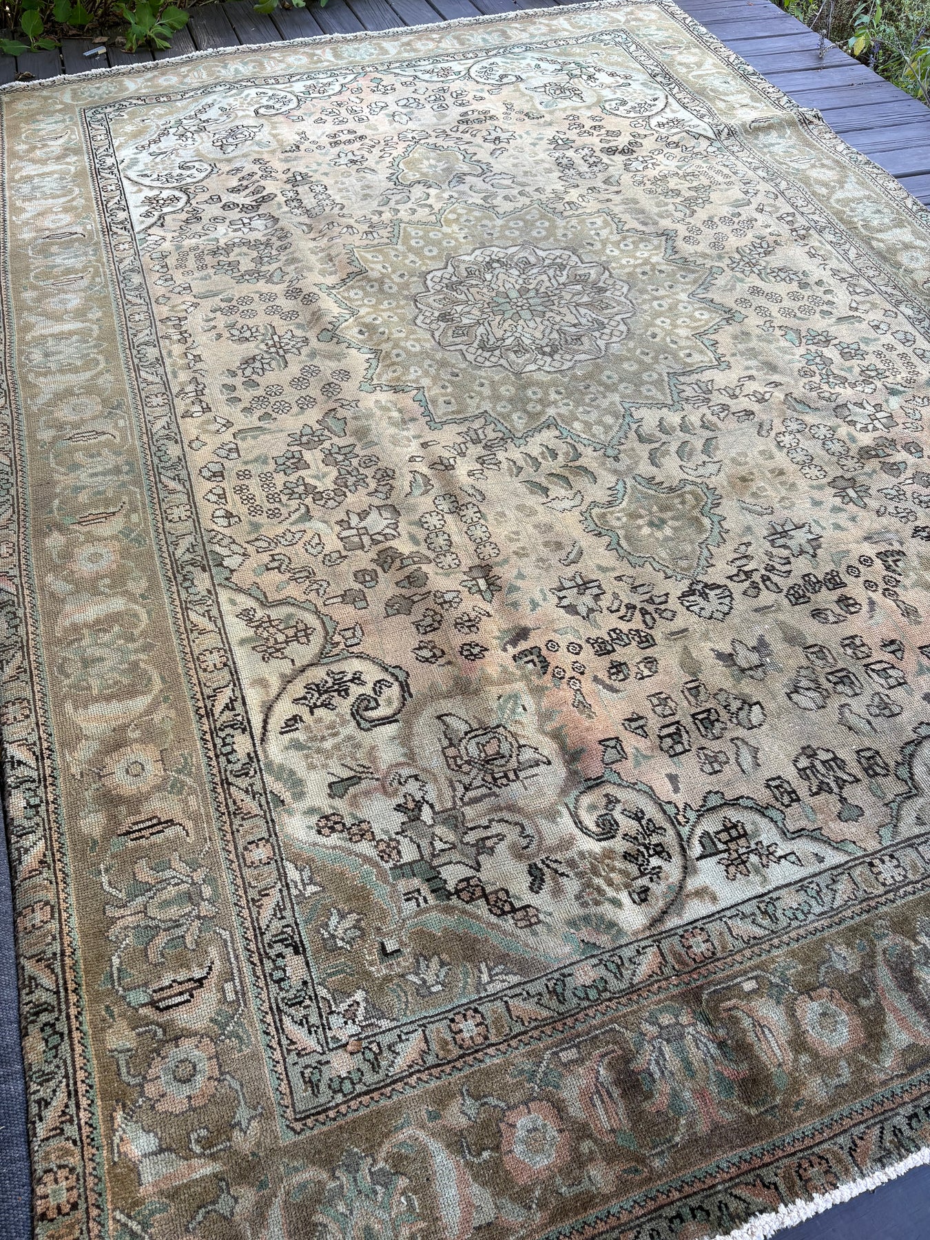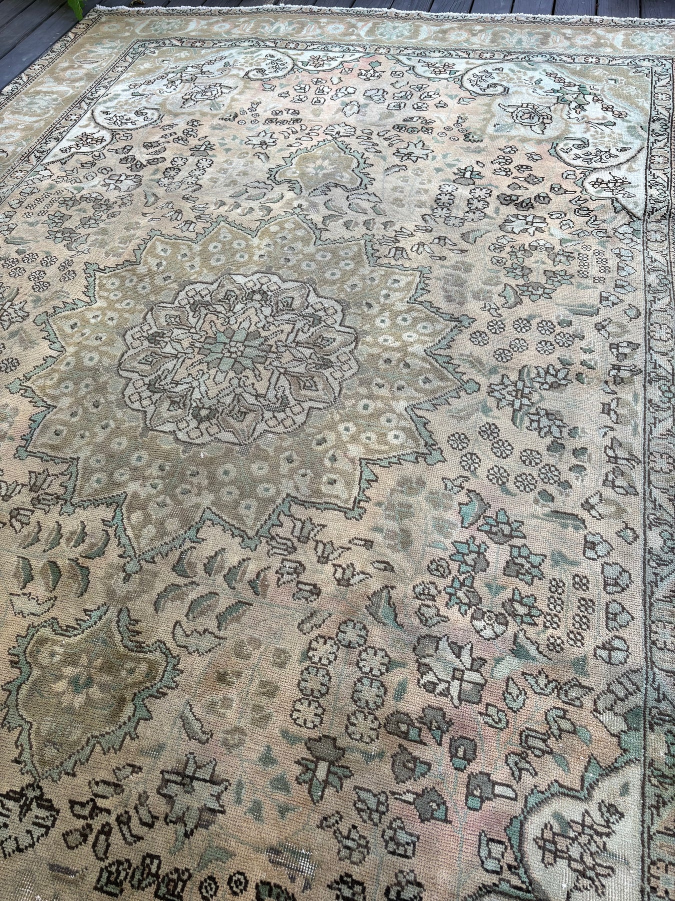 This rug is vintage. Please refer to photos for condition. We do our best to photograph these rugs in natural and artificial light but colors may appear different from what is shown on your screen. All of our rugs and pillows are vintage and/or antique. Due to their hand made nature and age, rugs may show discrepancies such as, repairs, tears, holes, wear, fading, discoloration, odor etc. We respect the character and history of our textiles, and do not consider these defects.