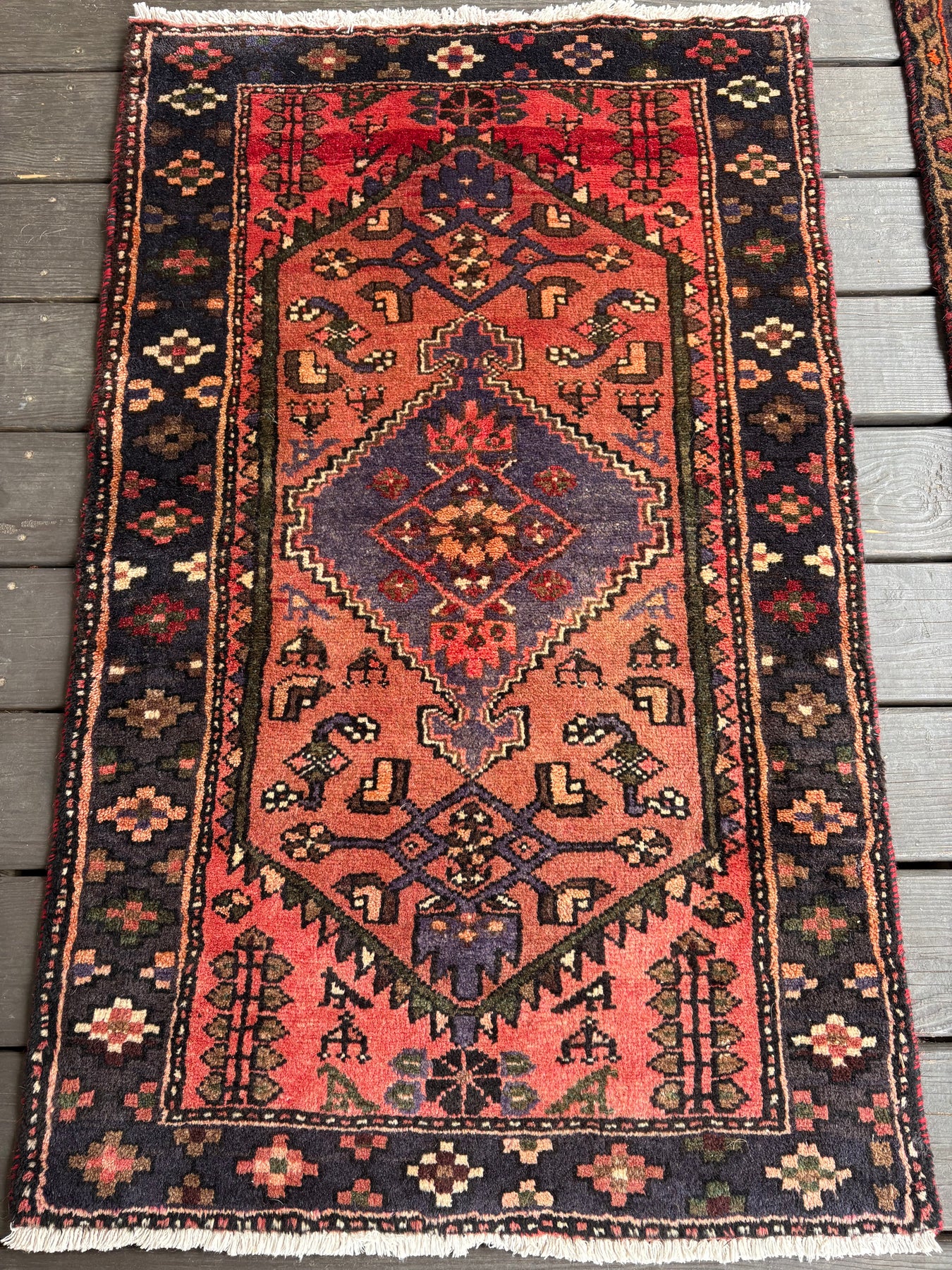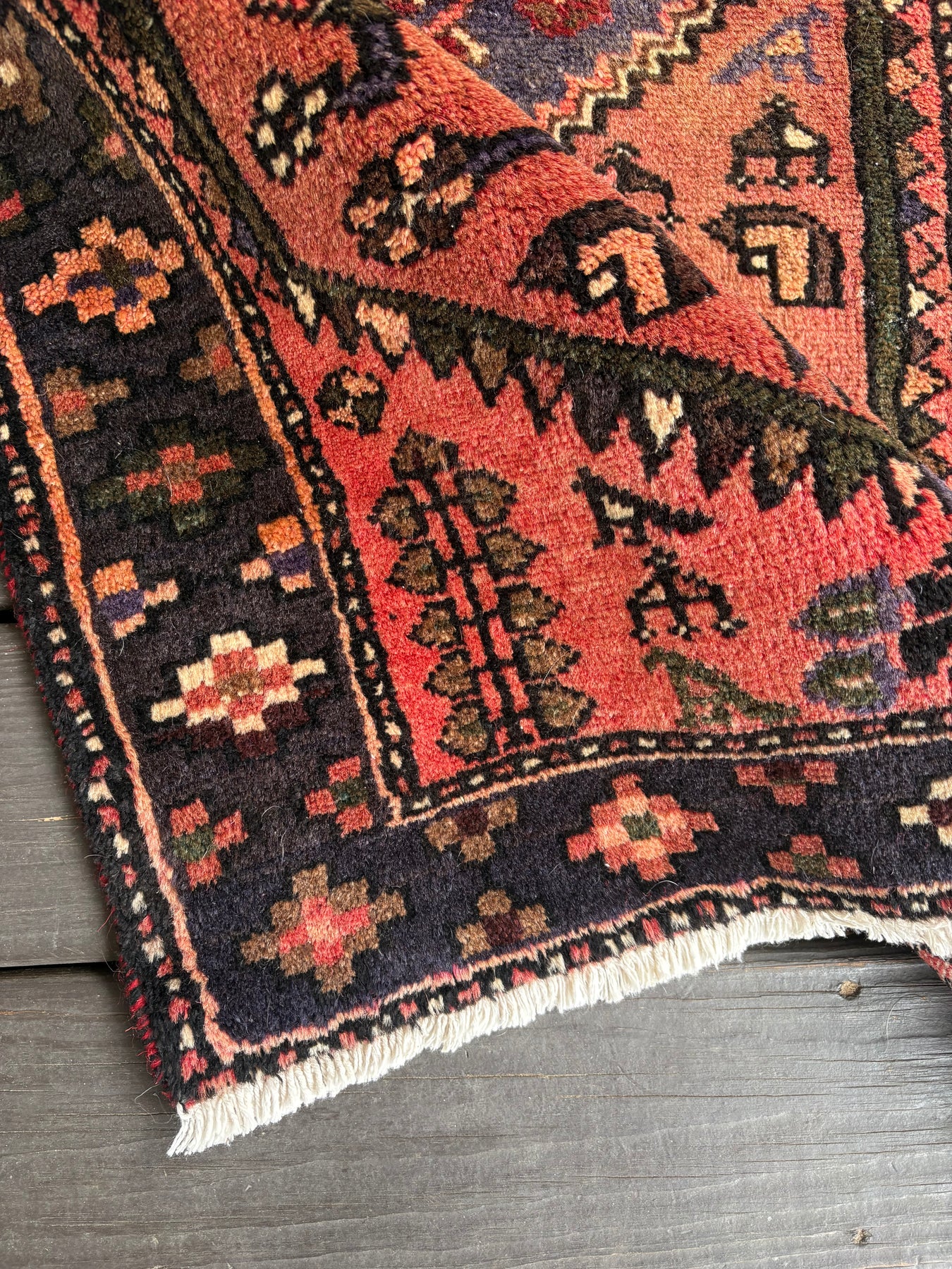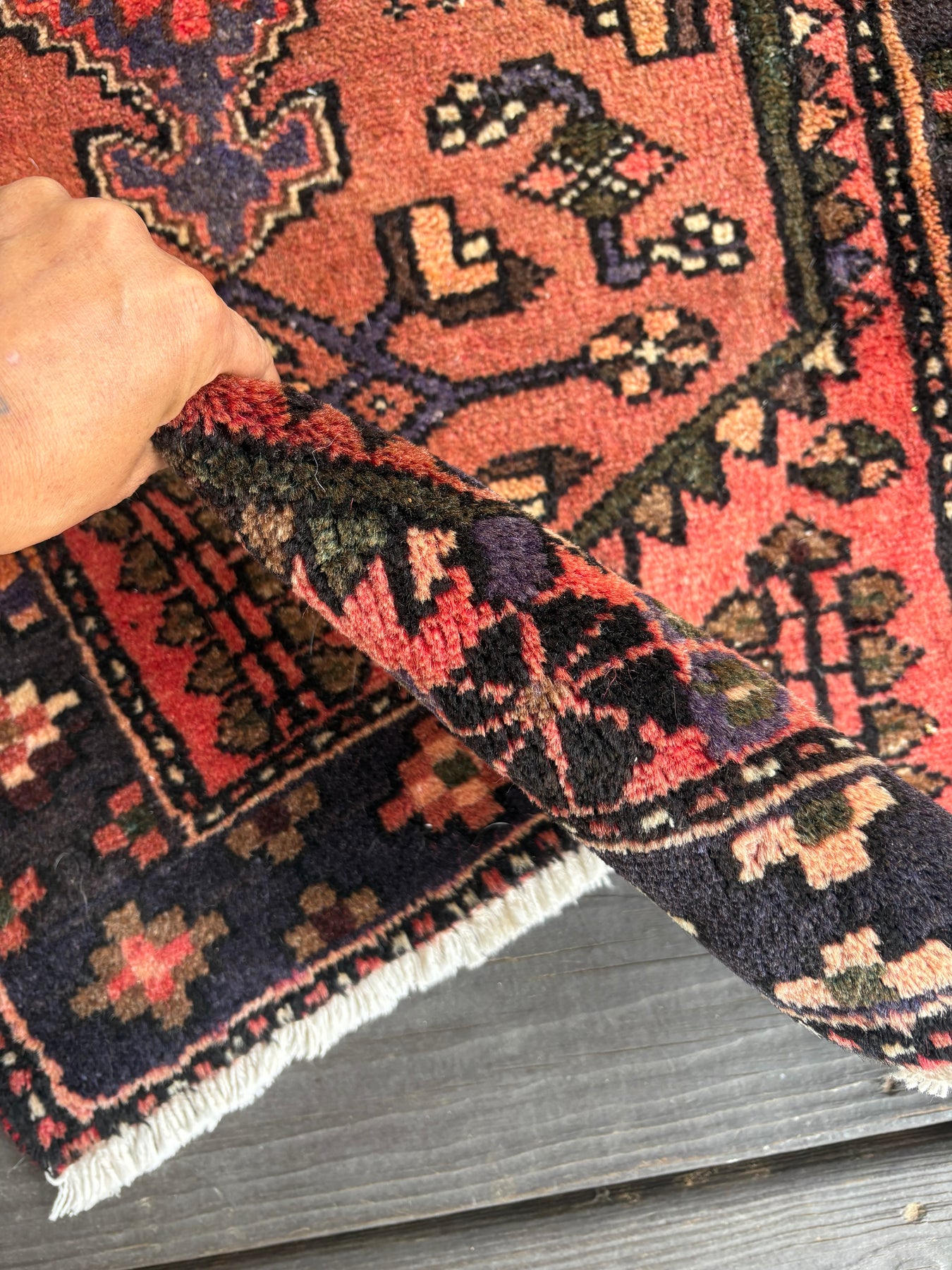 This rug is vintage. Please refer to photos for condition. We do our best to photograph these rugs in natural and artificial light but colors may appear different from what is shown on your screen. All of our rugs and pillows are vintage and/or antique. Due to their hand made nature and age, rugs may show discrepancies such as, repairs, tears, holes, wear, fading, discoloration, odor etc. We respect the character and history of our textiles, and do not consider these defects.