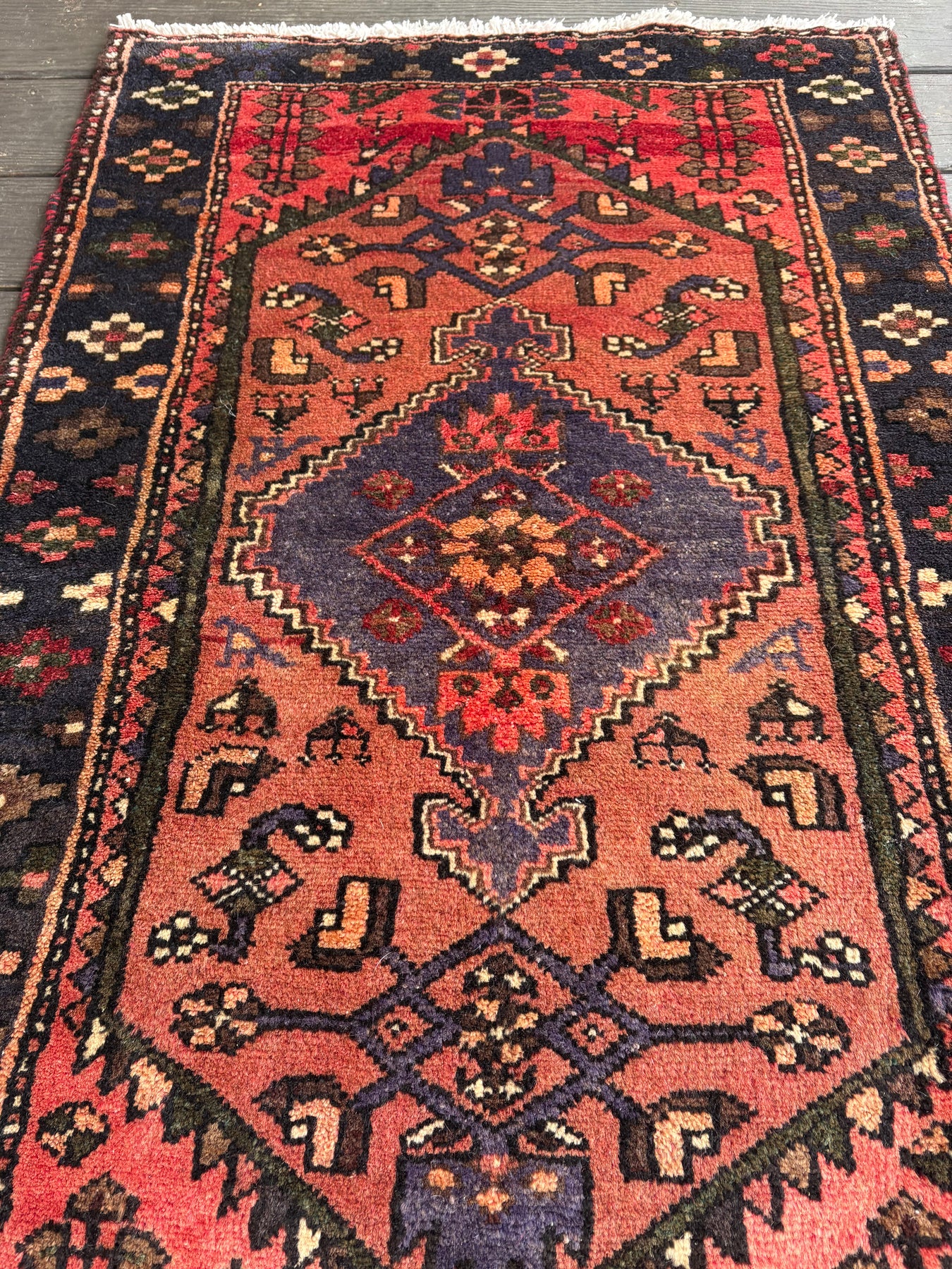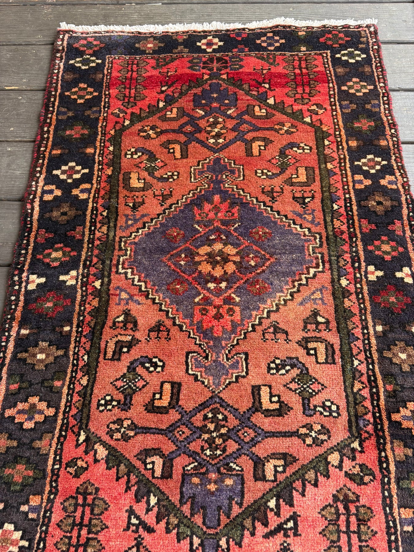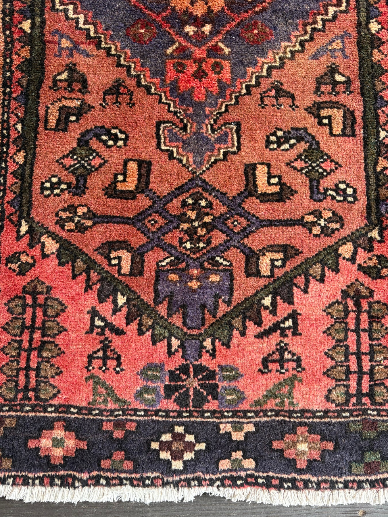 This rug is vintage. Please refer to photos for condition. We do our best to photograph these rugs in natural and artificial light but colors may appear different from what is shown on your screen. All of our rugs and pillows are vintage and/or antique. Due to their hand made nature and age, rugs may show discrepancies such as, repairs, tears, holes, wear, fading, discoloration, odor etc. We respect the character and history of our textiles, and do not consider these defects.