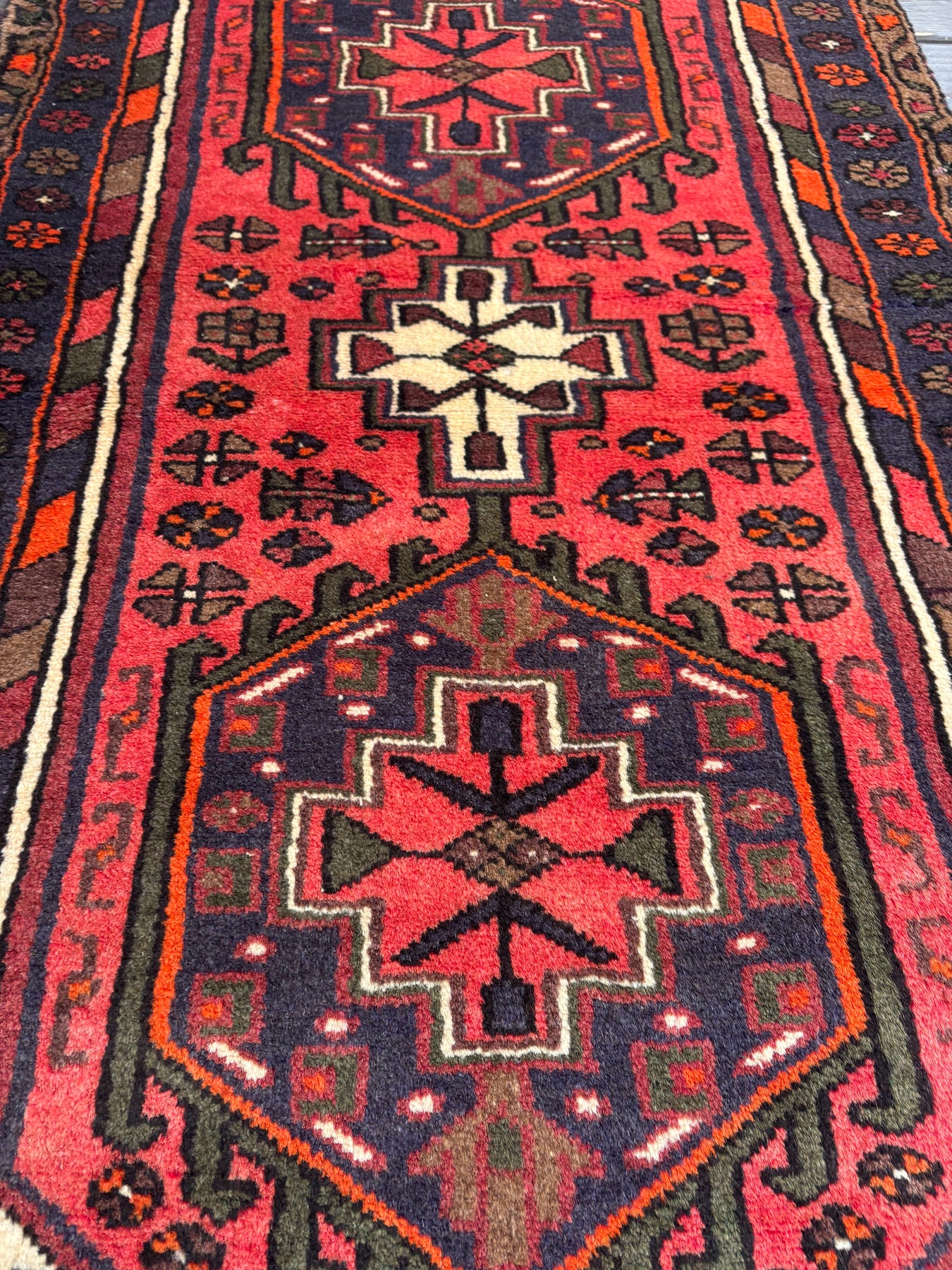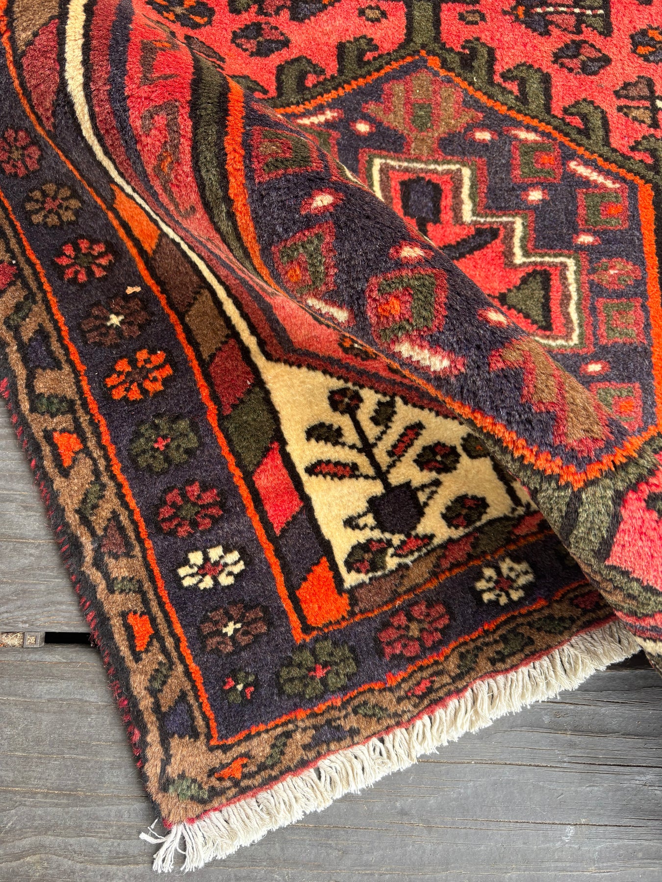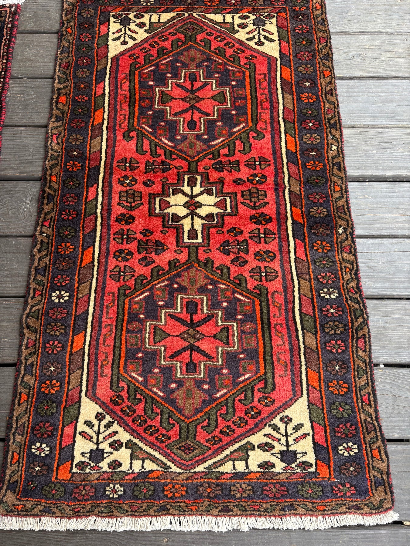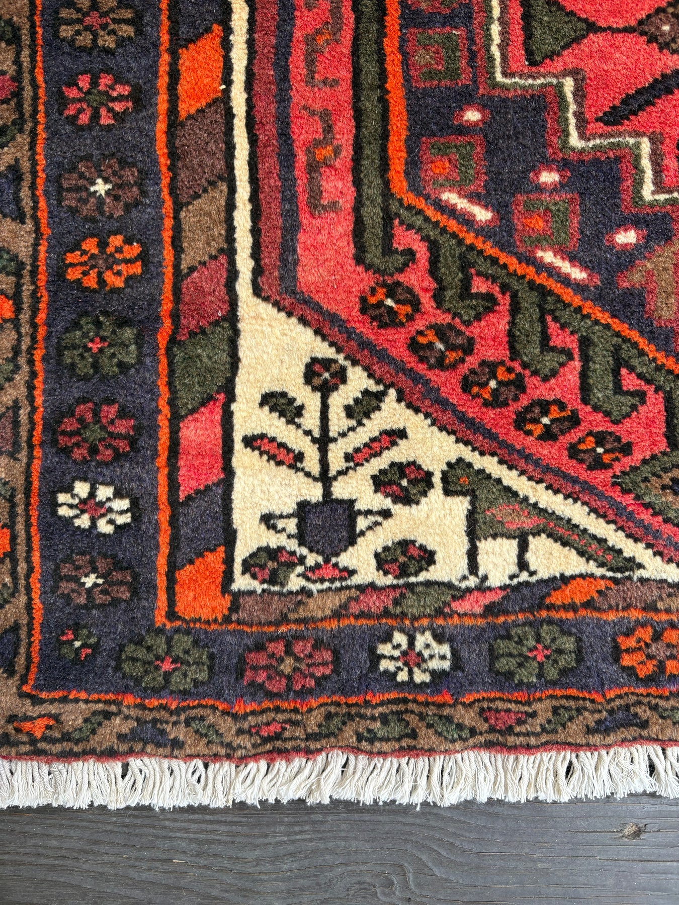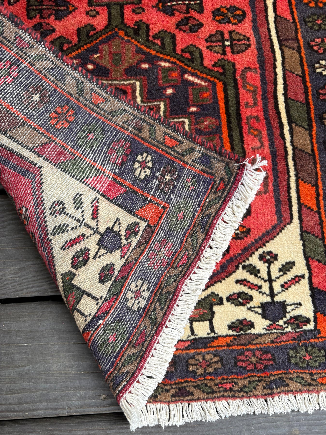 This rug is vintage. Please refer to photos for condition. We do our best to photograph these rugs in natural and artificial light but colors may appear different from what is shown on your screen. All of our rugs and pillows are vintage and/or antique. Due to their hand made nature and age, rugs may show discrepancies such as, repairs, tears, holes, wear, fading, discoloration, odor etc. We respect the character and history of our textiles, and do not consider these defects.