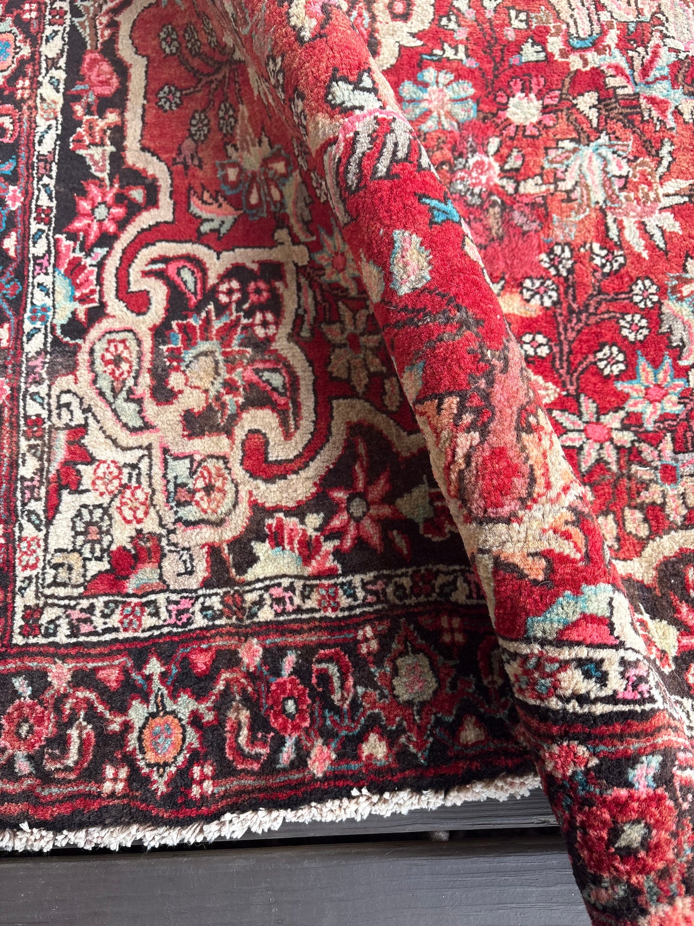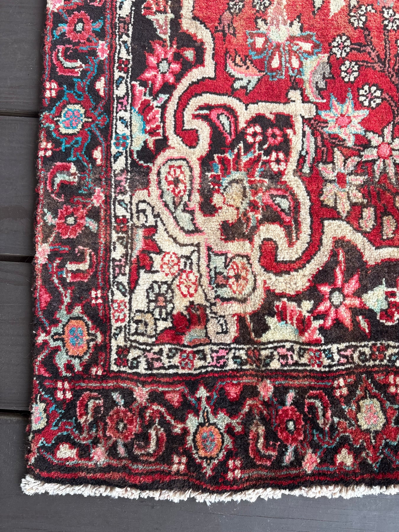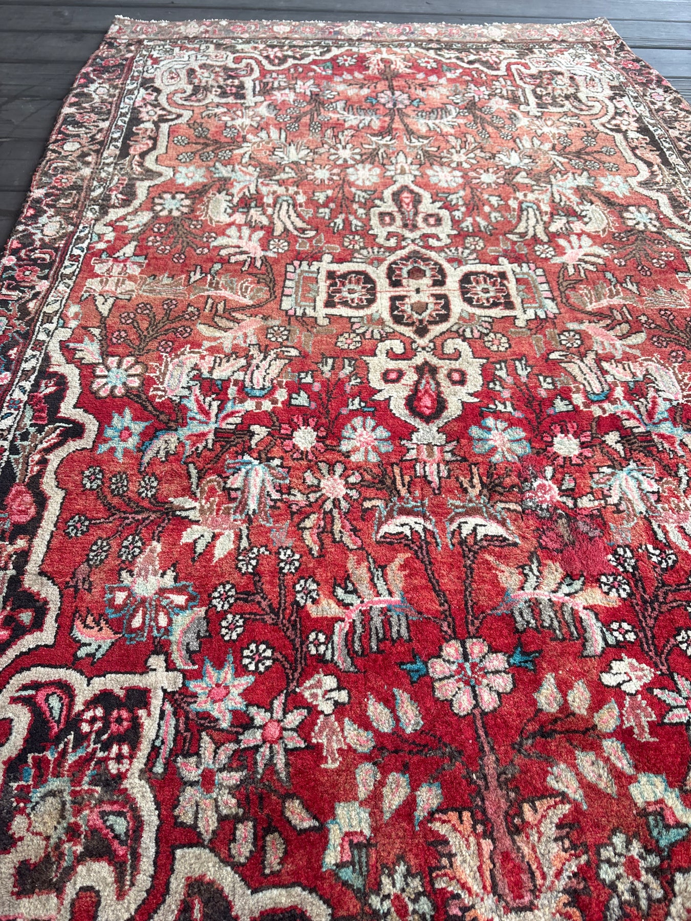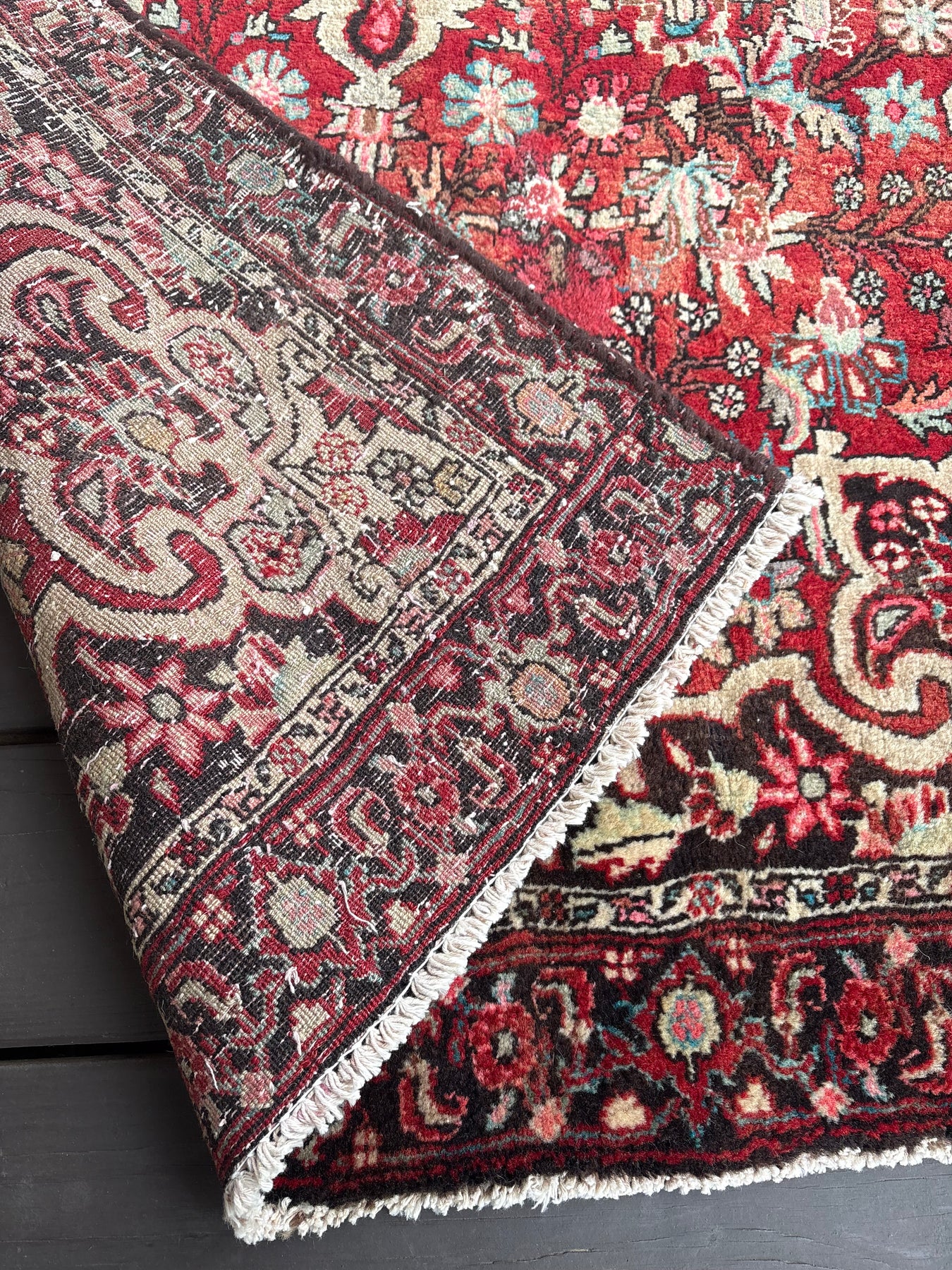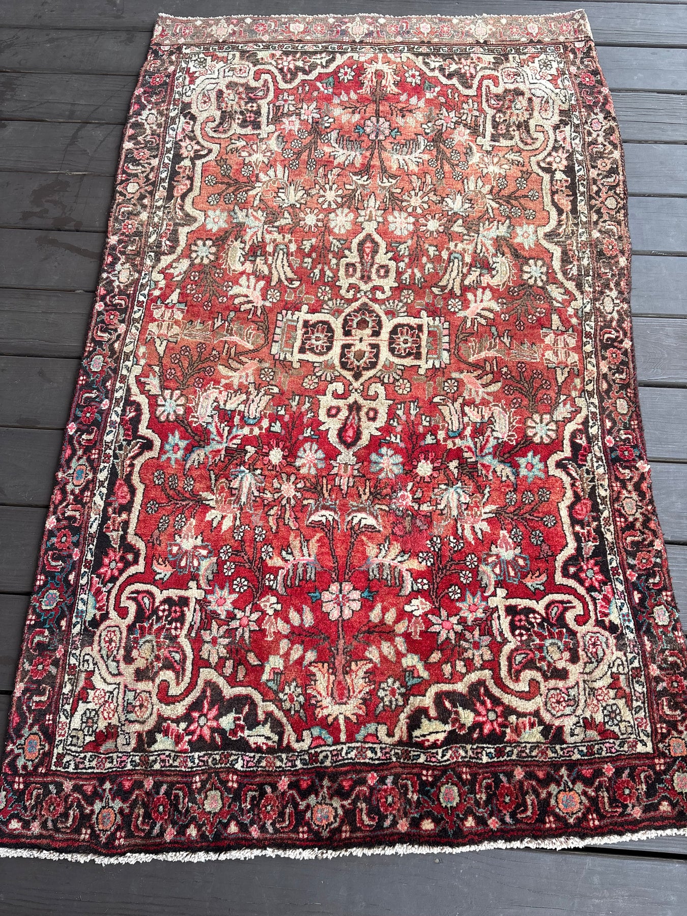 This rug is vintage. Please refer to photos for condition. We do our best to photograph these rugs in natural and artificial light but colors may appear different from what is shown on your screen. All of our rugs and pillows are vintage and/or antique. Due to their hand made nature and age, rugs may show discrepancies such as, repairs, tears, holes, wear, fading, discoloration, odor etc. We respect the character and history of our textiles, and do not consider these defects.