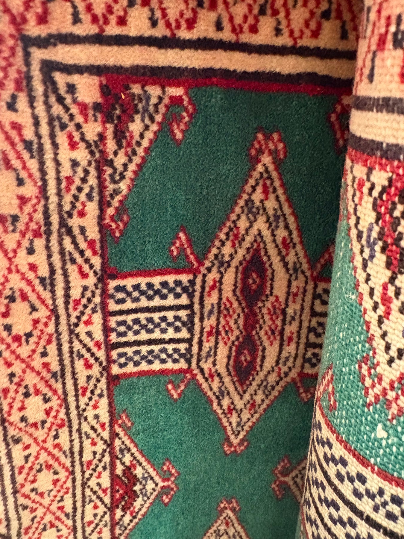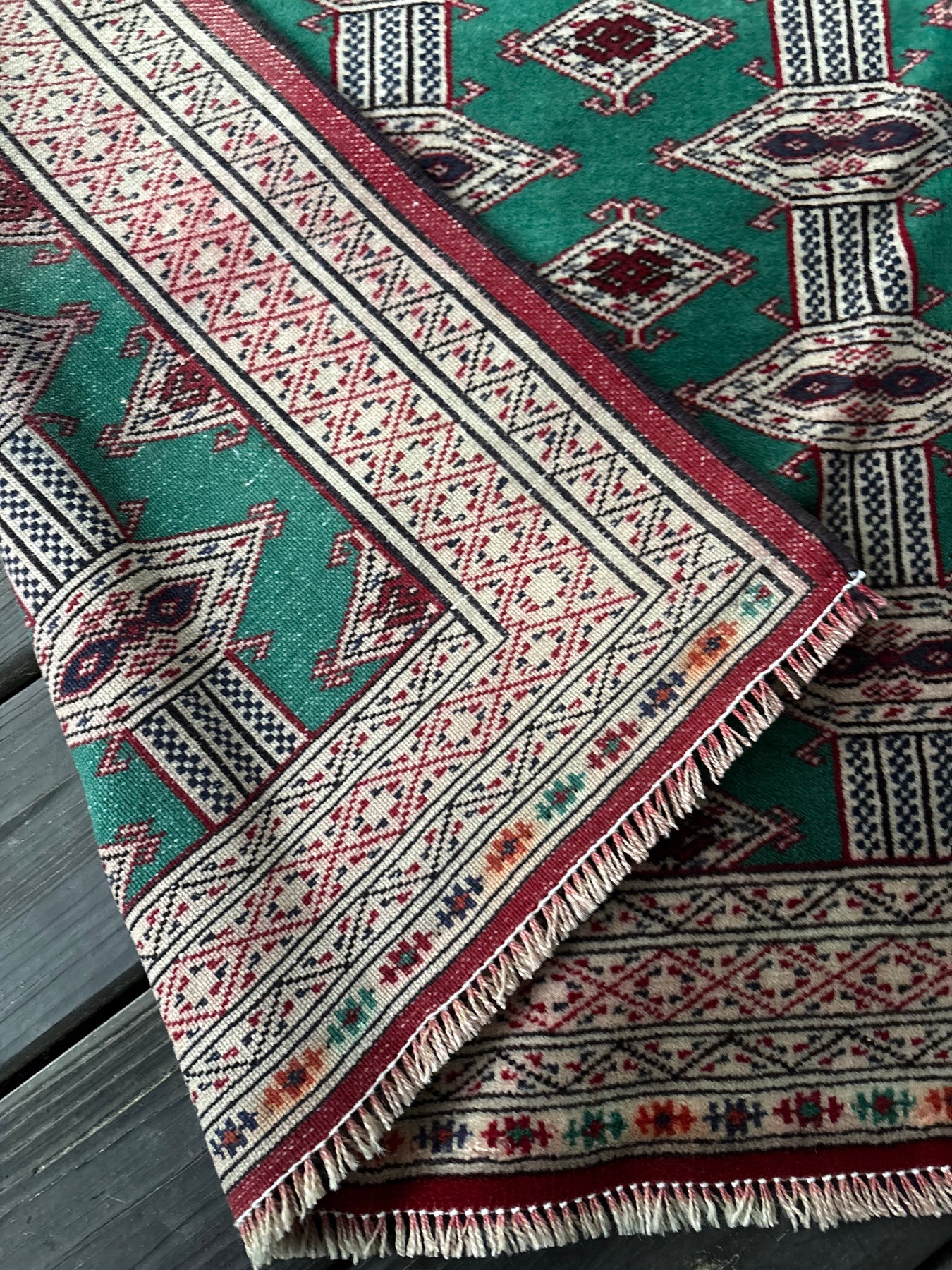 This rug is vintage. Please refer to photos for condition. We do our best to photograph these rugs in natural and artificial light but colors may appear different from what is shown on your screen. All of our rugs and pillows are vintage and/or antique. Due to their hand made nature and age, rugs may show discrepancies such as, repairs, tears, holes, wear, fading, discoloration, odor etc. We respect the character and history of our textiles, and do not consider these defects.
