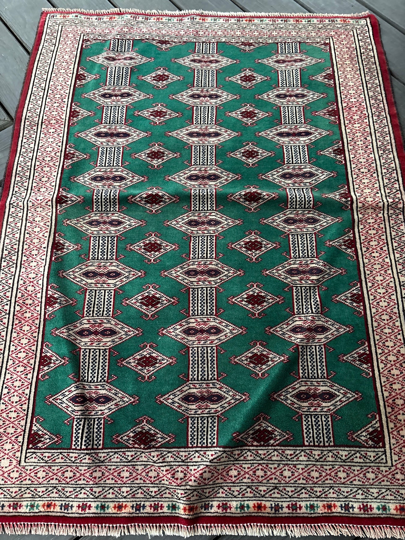 Shannon is a beautiful bohkara rug and is hand knotted and woven from wool. She has a low pile, that is easy to clean up but is still soft underfoot. This rug measures approximately 3x4 at the widest bulge and has a very pretty palette of emerald green, camel with gray and red accents. She carries the traditional gul design.
