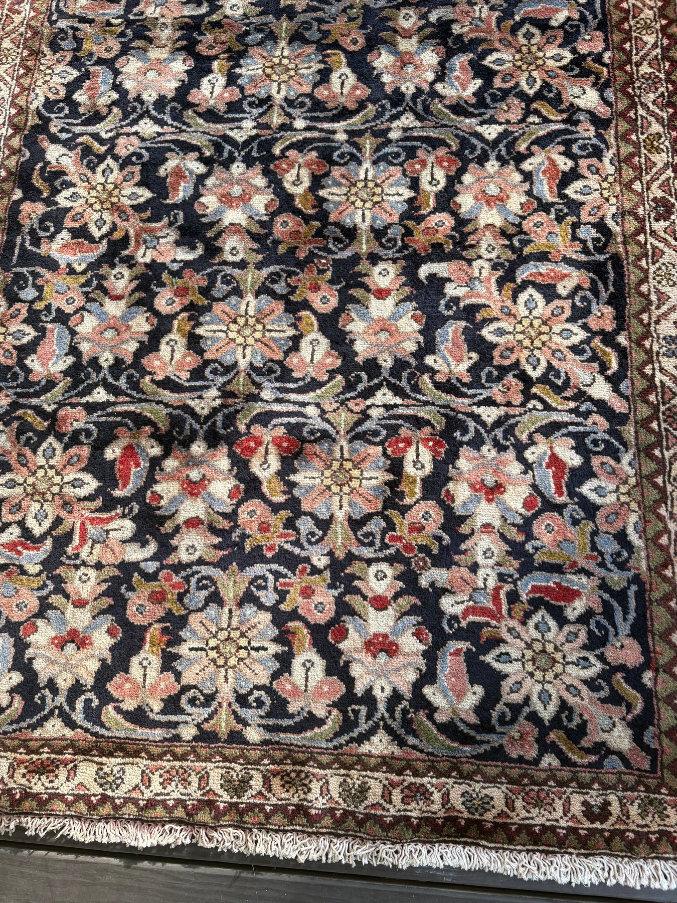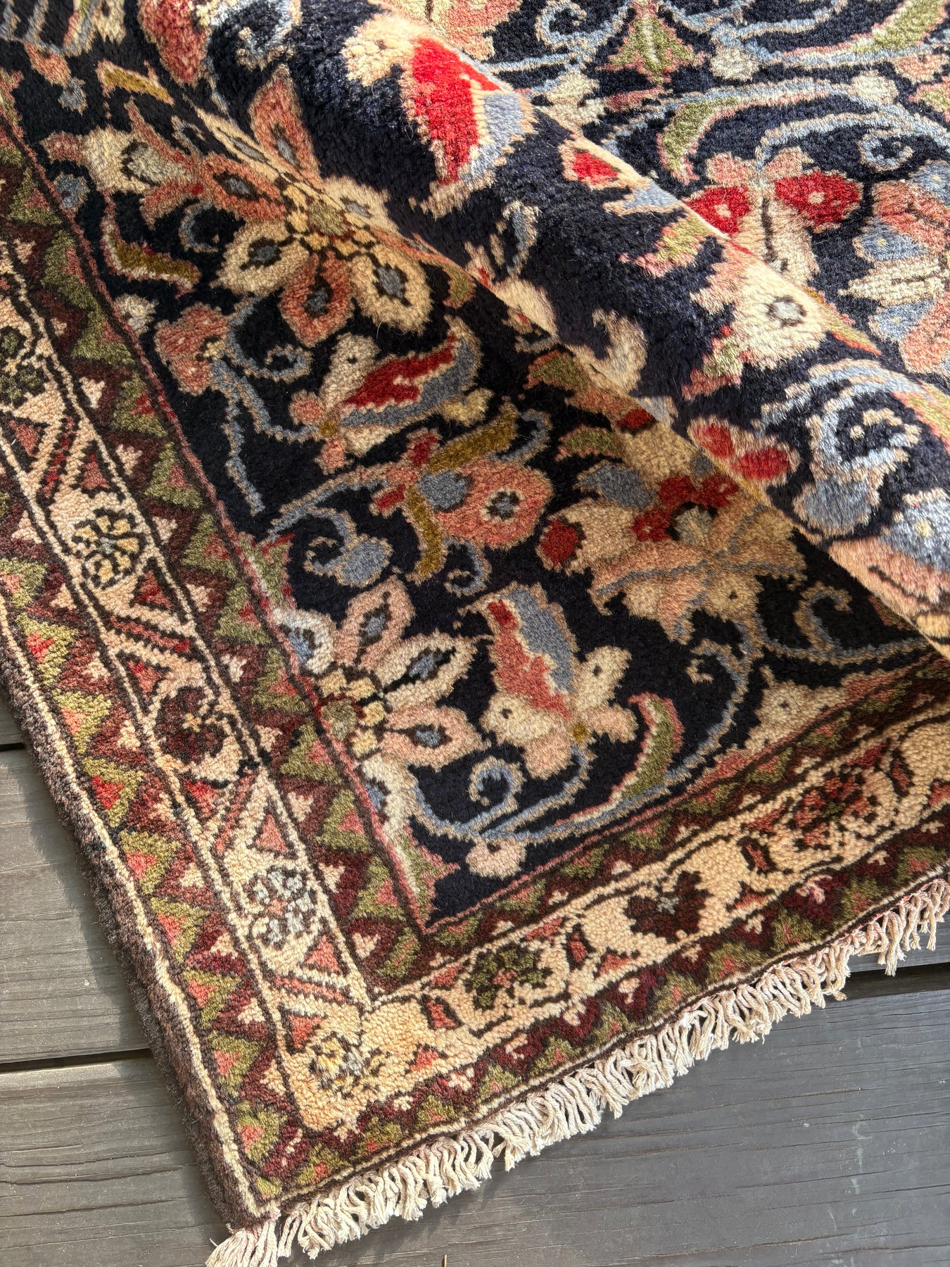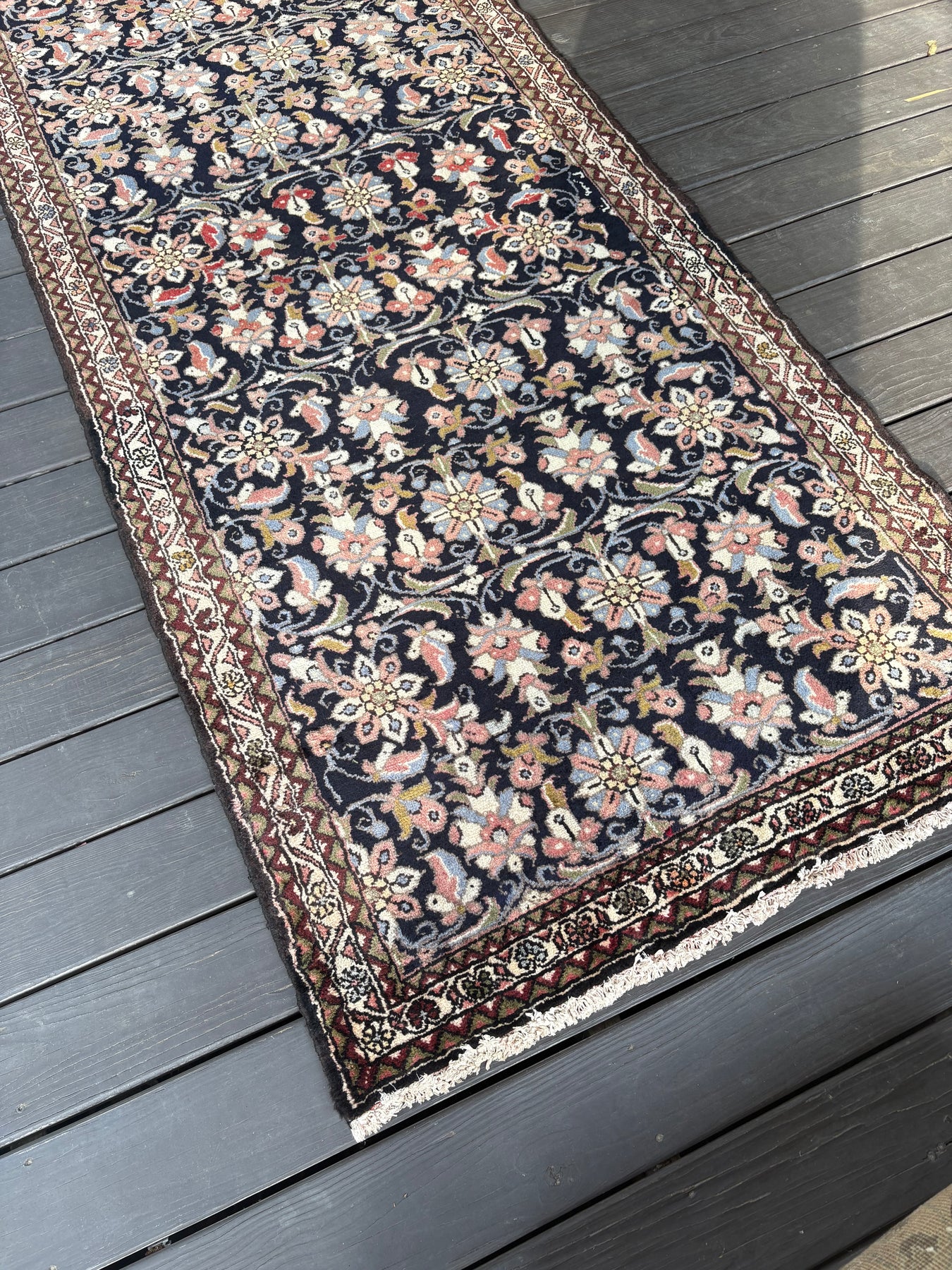 Iago is a beautiful persian runner rug and is hand knotted and woven from wool. She has a low pile, that is easy to clean up but is still soft underfoot. This rug measures approximately 3’3x8’5 at the widest bulge and has a very pretty palette of navy, with pink and green accents. She carries the traditional four seasons design. Though I see parrots 😆