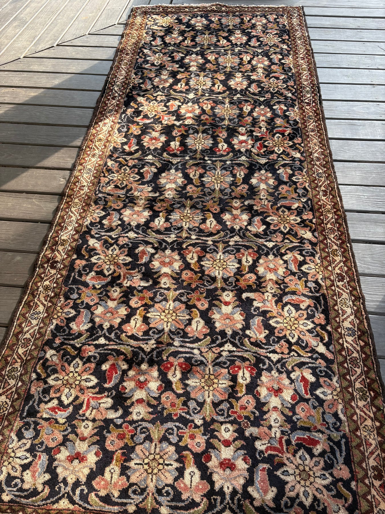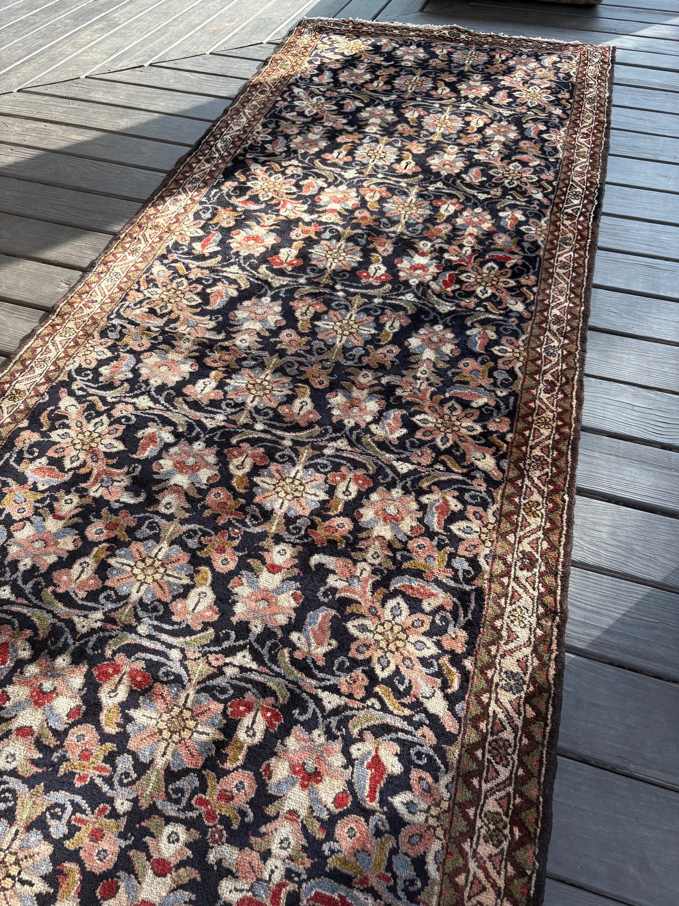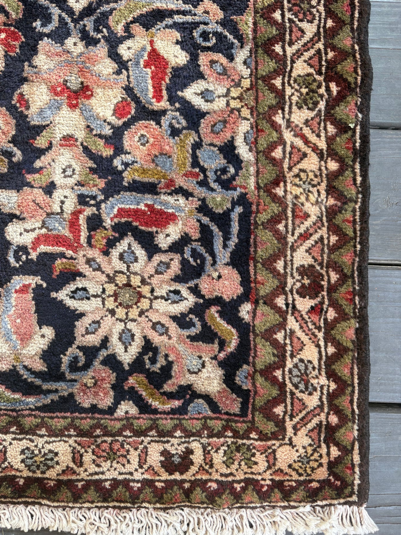 Iago is a beautiful persian runner rug and is hand knotted and woven from wool. She has a low pile, that is easy to clean up but is still soft underfoot. This rug measures approximately 3’3x8’5 at the widest bulge and has a very pretty palette of navy, with pink and green accents. She carries the traditional four seasons design. Though I see parrots 😆