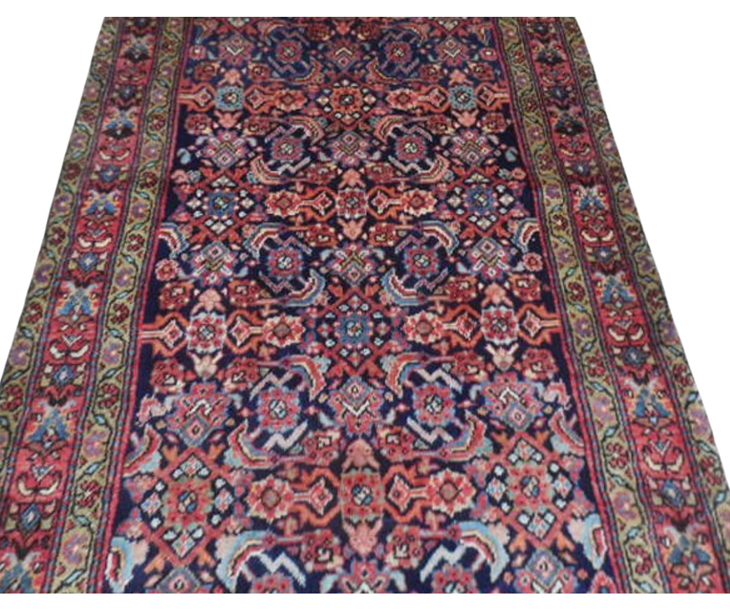 Haram is a beautiful oriental rug and is hand knotted and woven from wool. She has a low pile, that is easy to clean up but is still soft underfoot. This rug measures approximately  3’6x7 at the widest bulge and has a very pretty palette of navy, pink with camel and gold accents. She carries the traditional hearti or four season design.