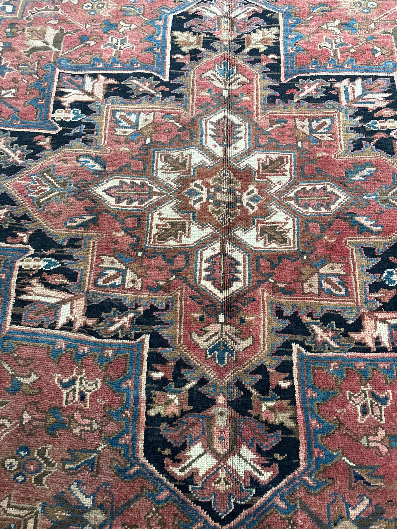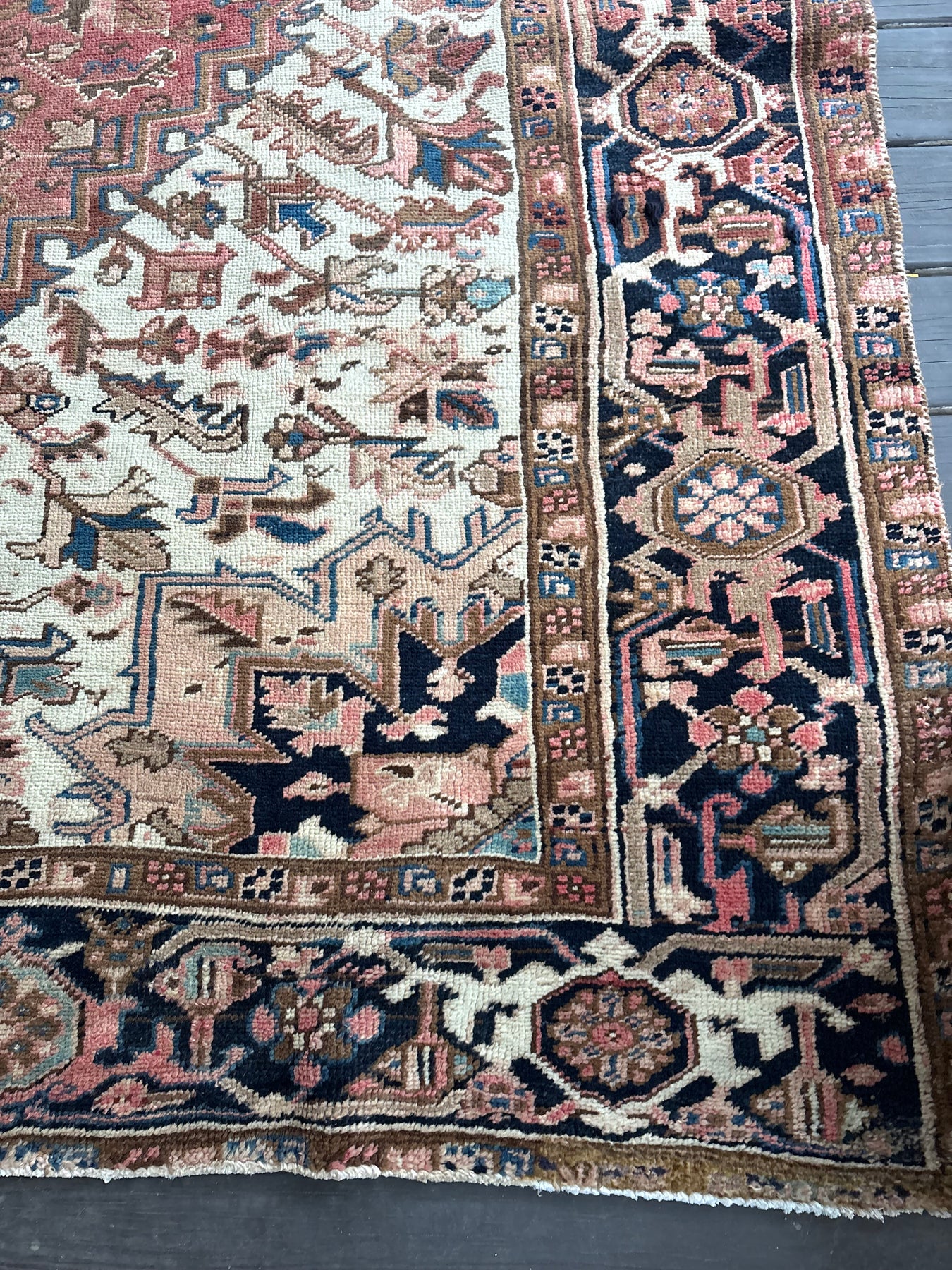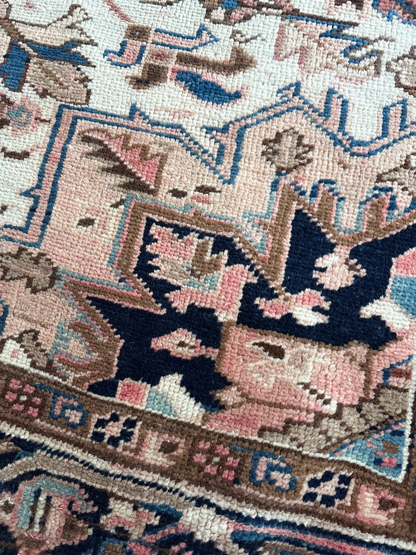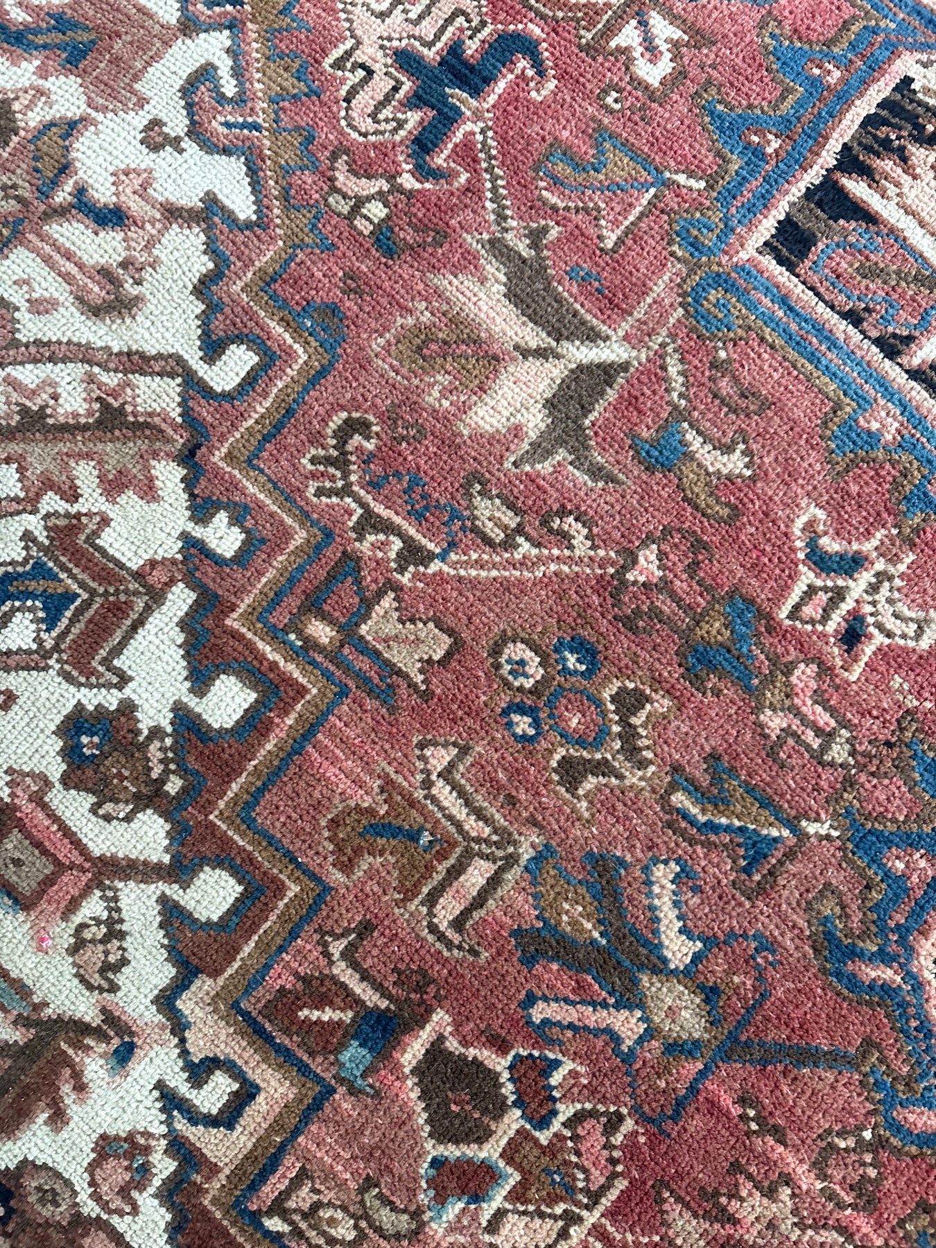 Antoinette a beautiful Heriz rug and is hand knotted and woven from wool. She has a low pile, that is easy to clean up but is still soft underfoot. This rug measures approximately 8’2x10’6 at the widest bulge and has a very pretty palette of robins egg blue, navy, rust with pink and camel accents. She carries the traditional diamond design.