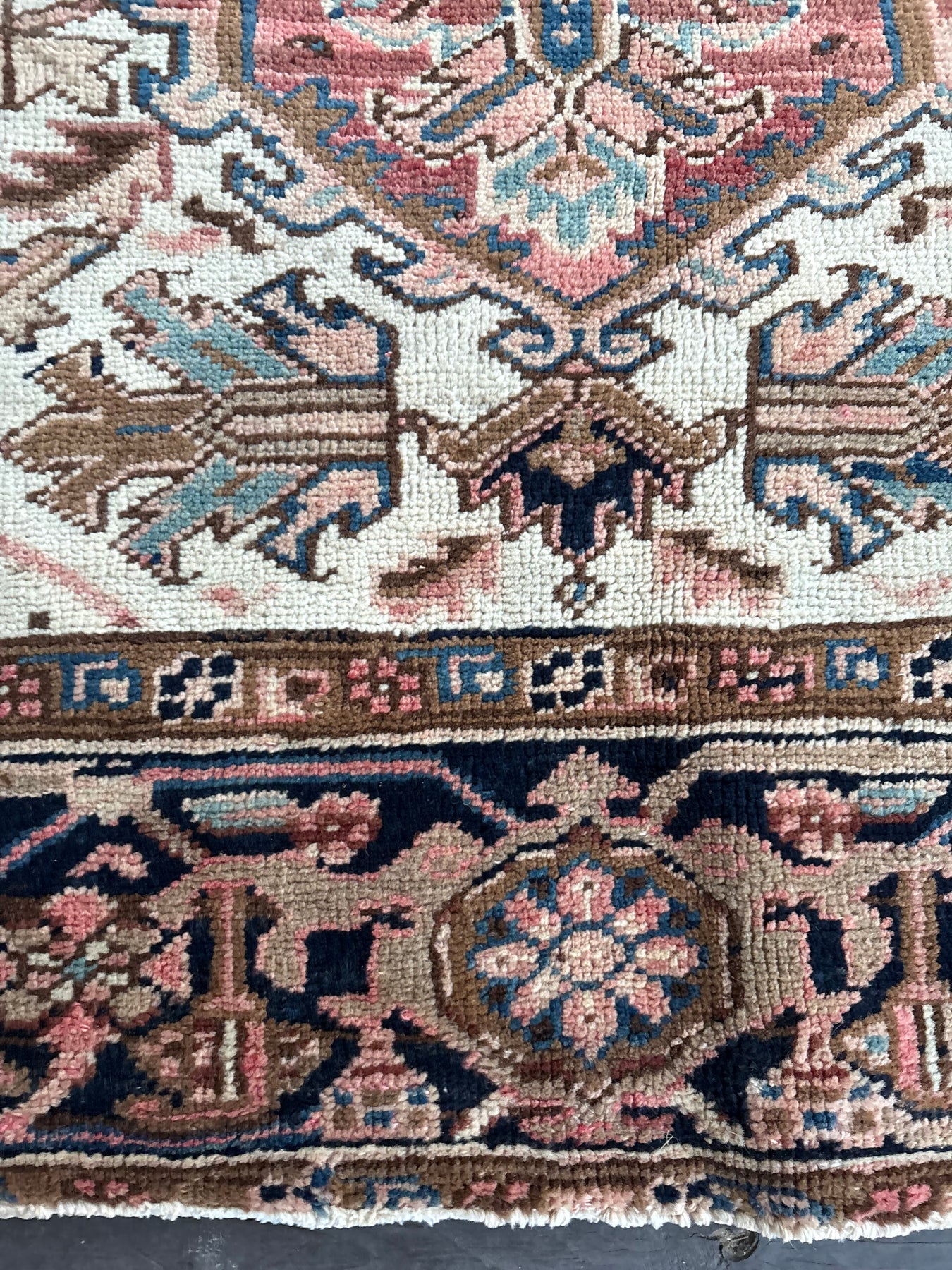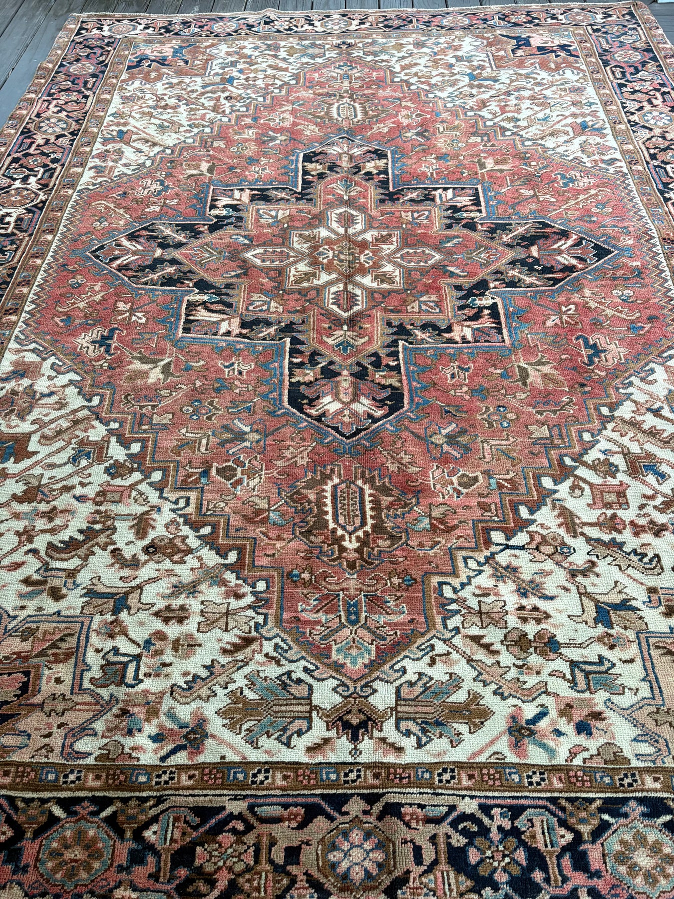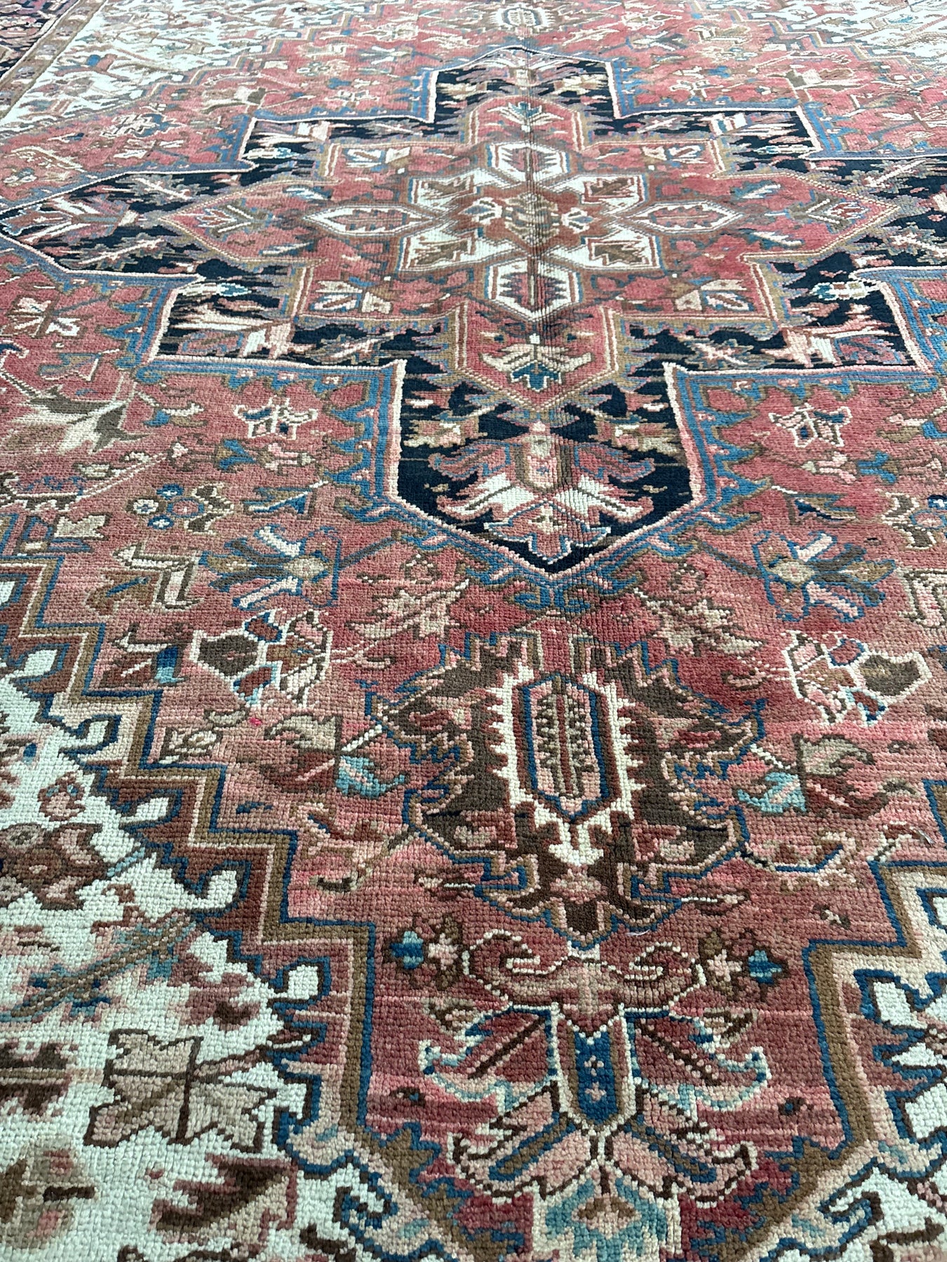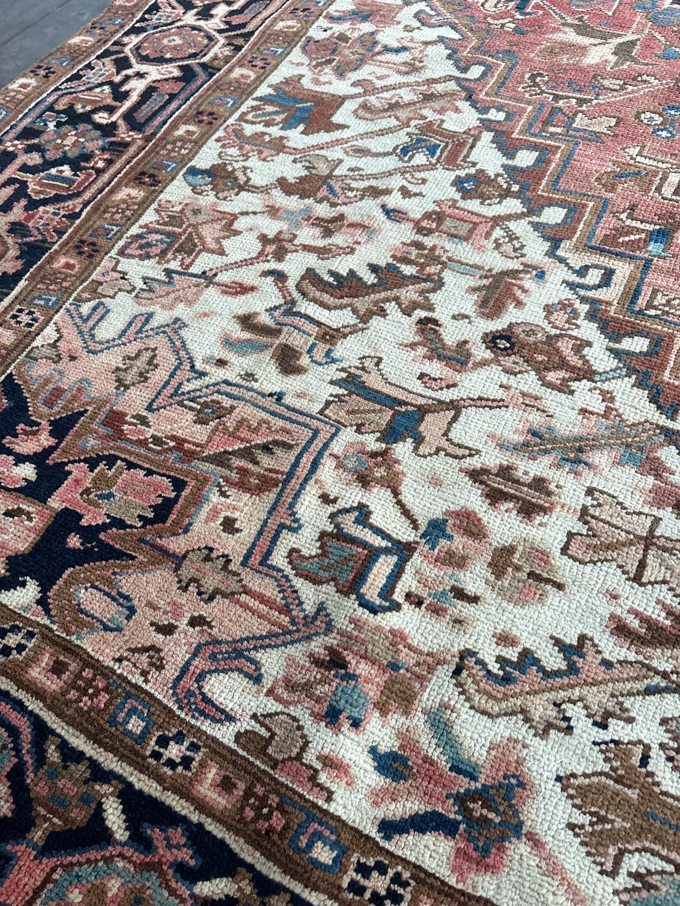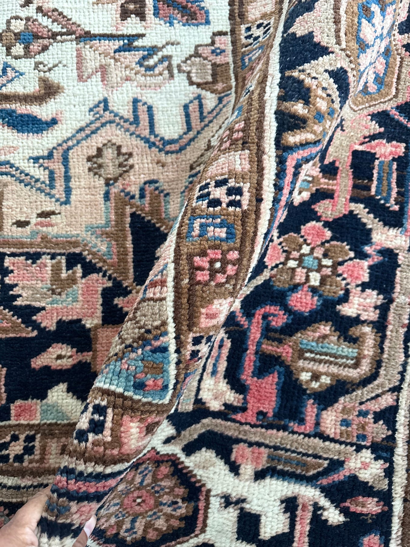 Antoinette a beautiful Heriz rug and is hand knotted and woven from wool. She has a low pile, that is easy to clean up but is still soft underfoot. This rug measures approximately 8’2x10’6 at the widest bulge and has a very pretty palette of robins egg blue, navy, rust with pink and camel accents. She carries the traditional diamond design.