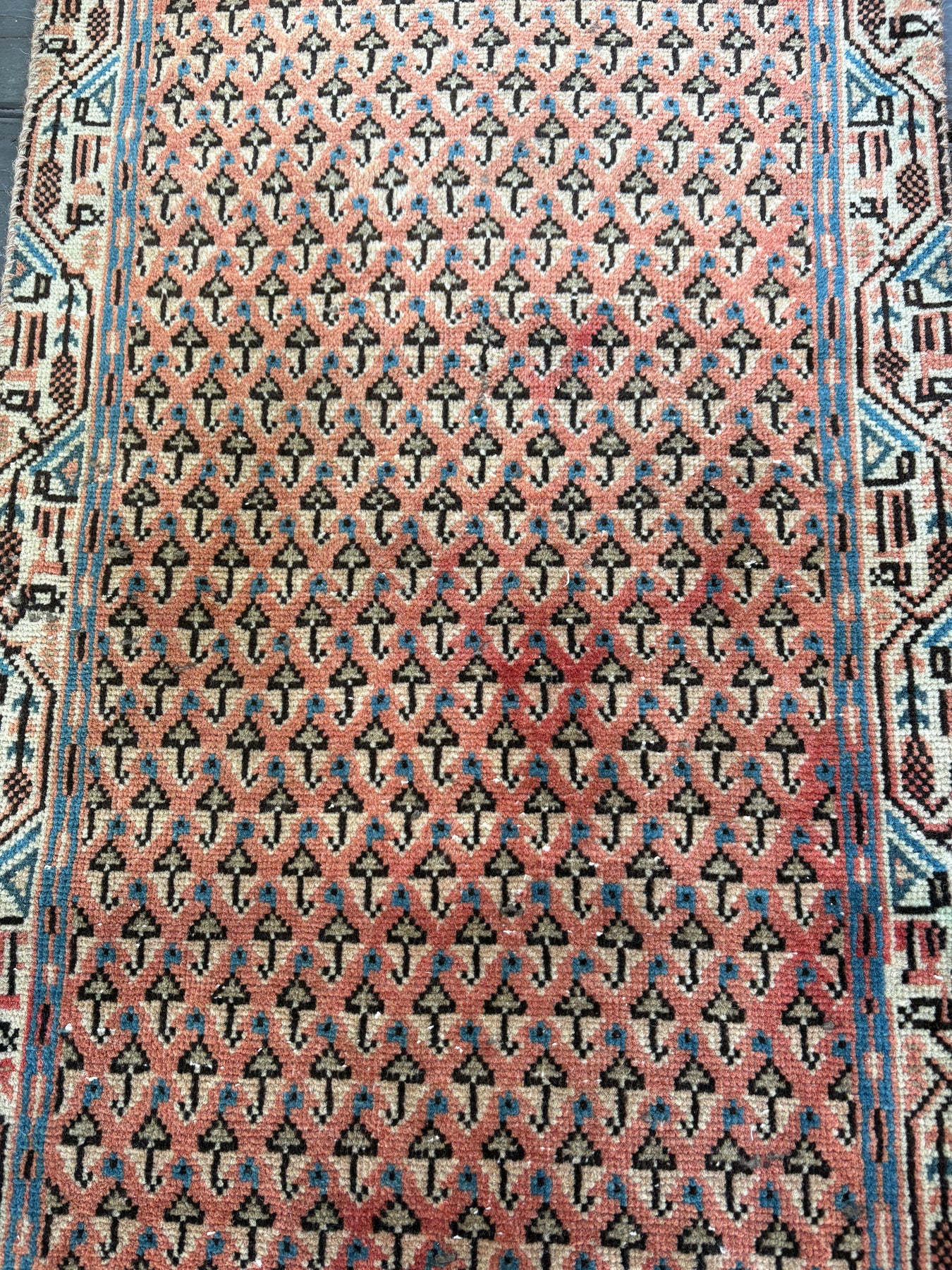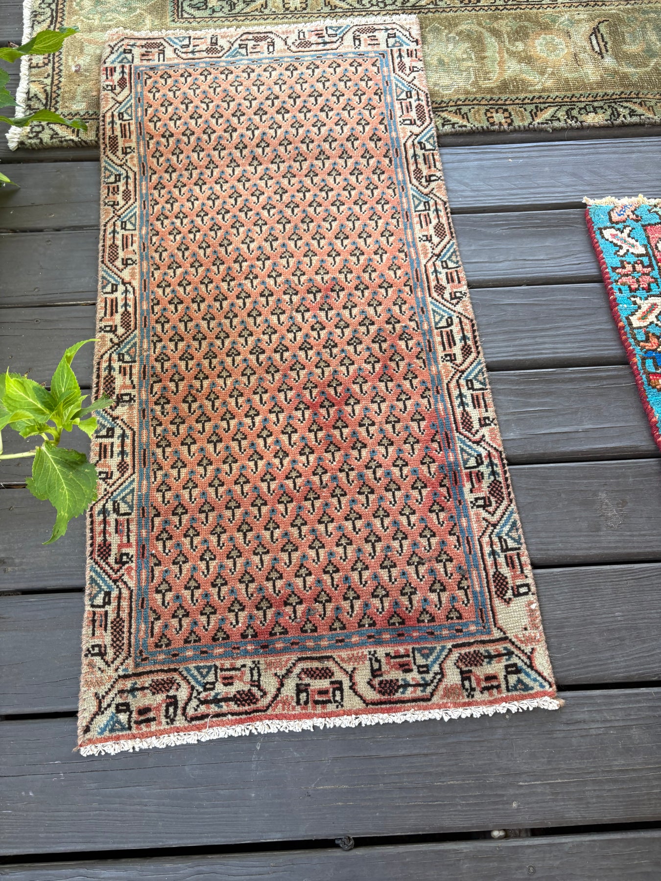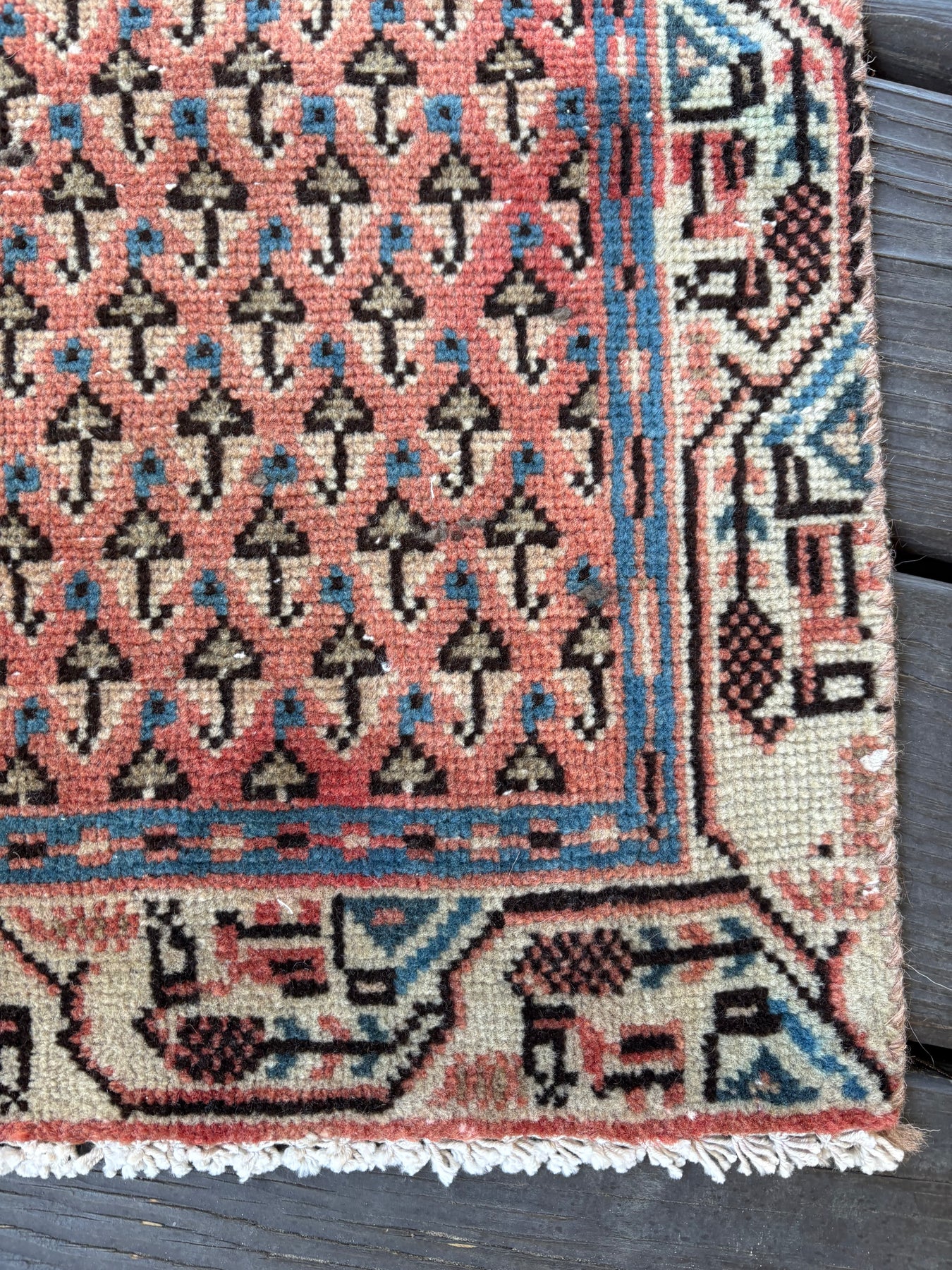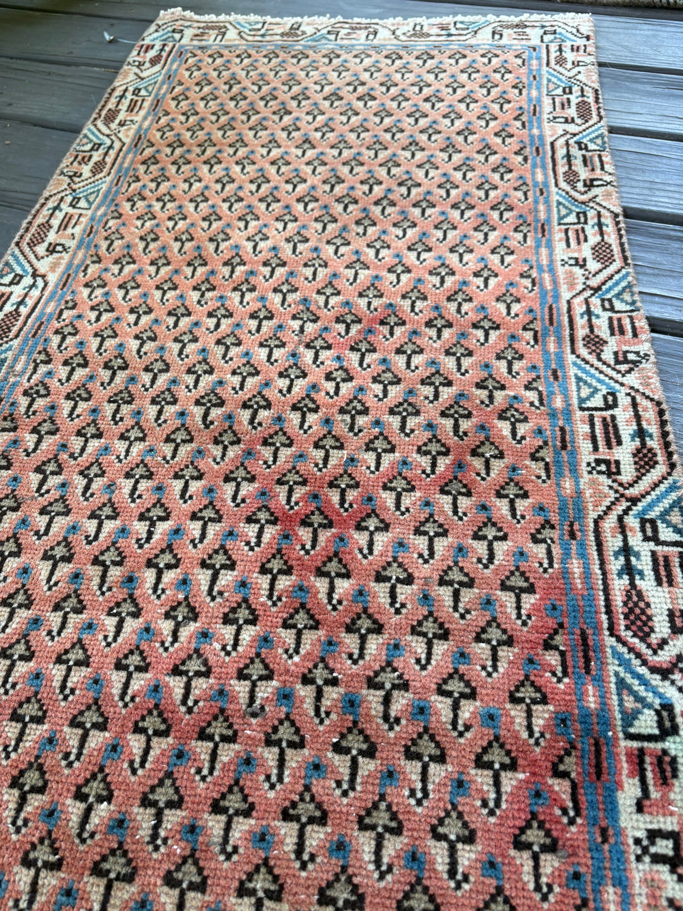 This rug is vintage. Please refer to photos for condition. We do our best to photograph these rugs in natural and artificial light but colors may appear different from what is shown on your screen. All of our rugs and pillows are vintage and/or antique. Due to their hand made nature and age, rugs may show discrepancies such as, repairs, tears, holes, wear, fading, discoloration, odor etc. We respect the character and history of our textiles, and do not consider these defects.