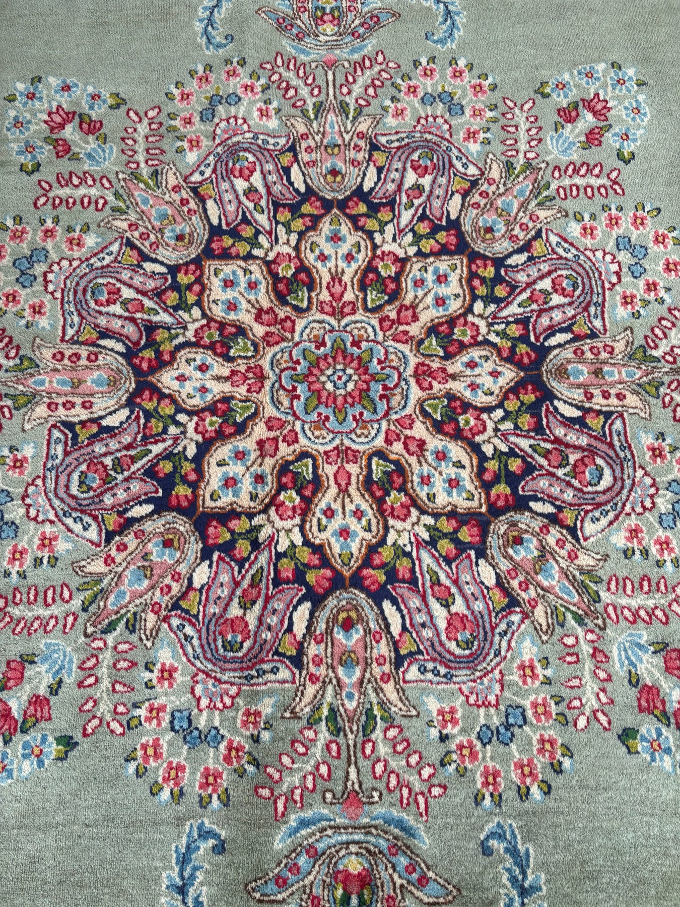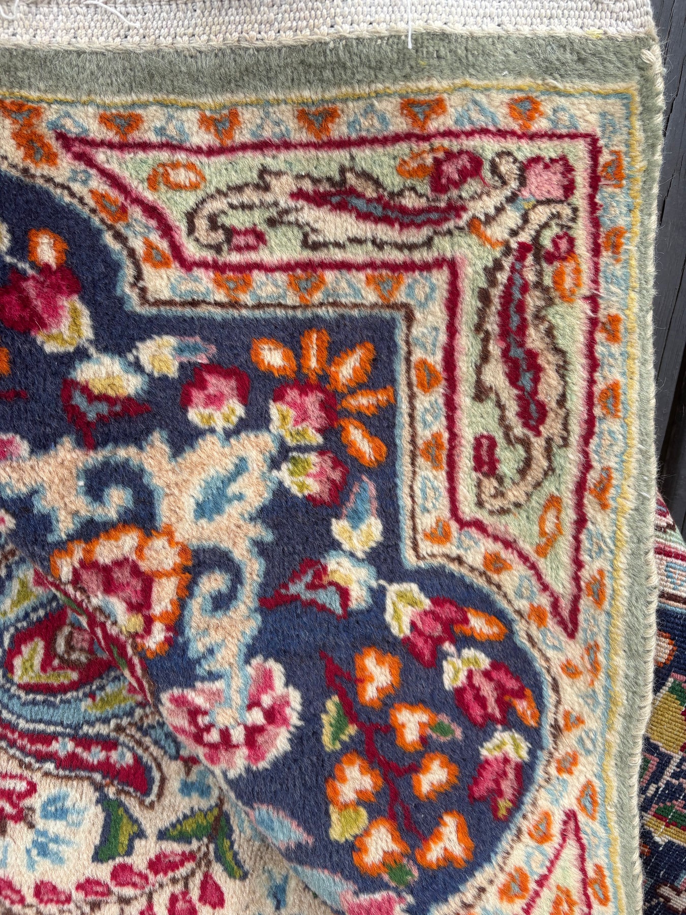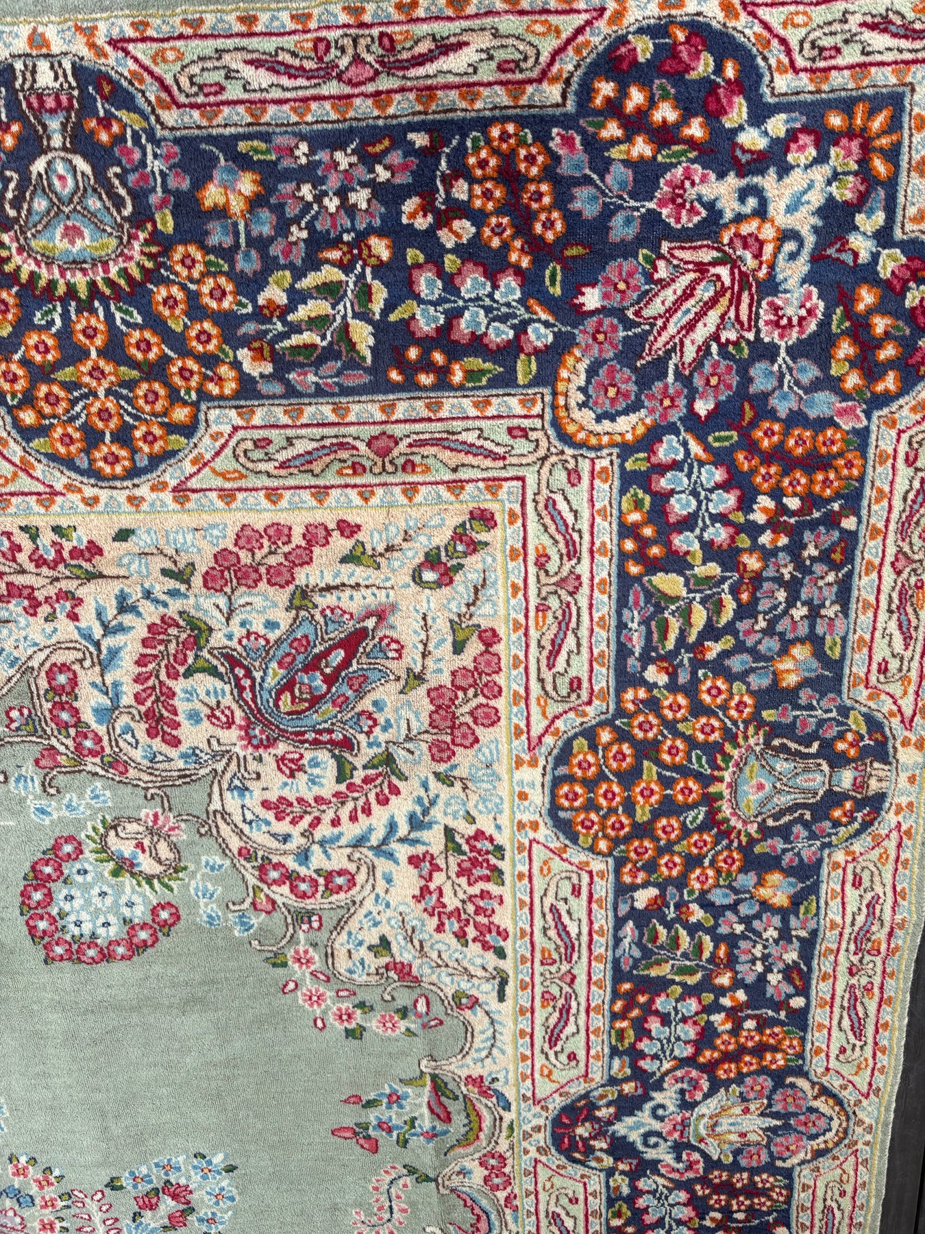 This is a beautiful kirman rug and is hand knotted and woven from wool. She has a low pile, that is easy to clean up but is still soft underfoot. This rug measures approximately 8x11’5 at the widest bulge and has a very pretty palette of pistachio green, with light blue, orange and navy accents. She carries the traditional diamond and floral design