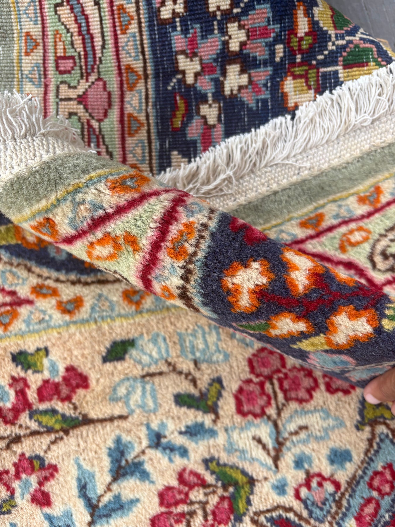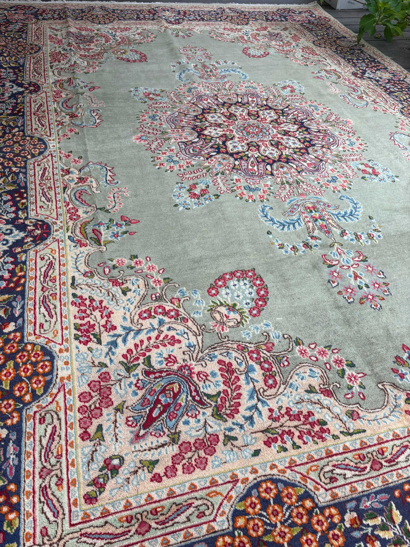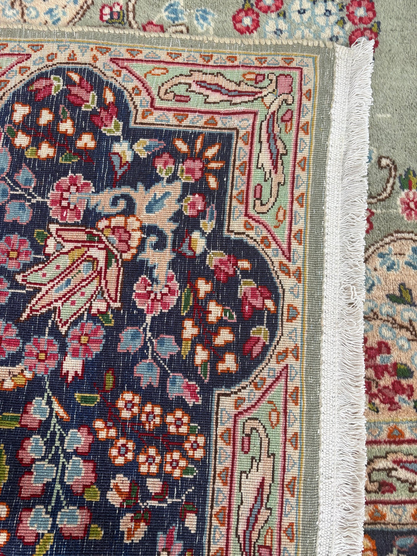 This is a beautiful kirman rug and is hand knotted and woven from wool. She has a low pile, that is easy to clean up but is still soft underfoot. This rug measures approximately 8x11’5 at the widest bulge and has a very pretty palette of pistachio green, with light blue, orange and navy accents. She carries the traditional diamond and floral design