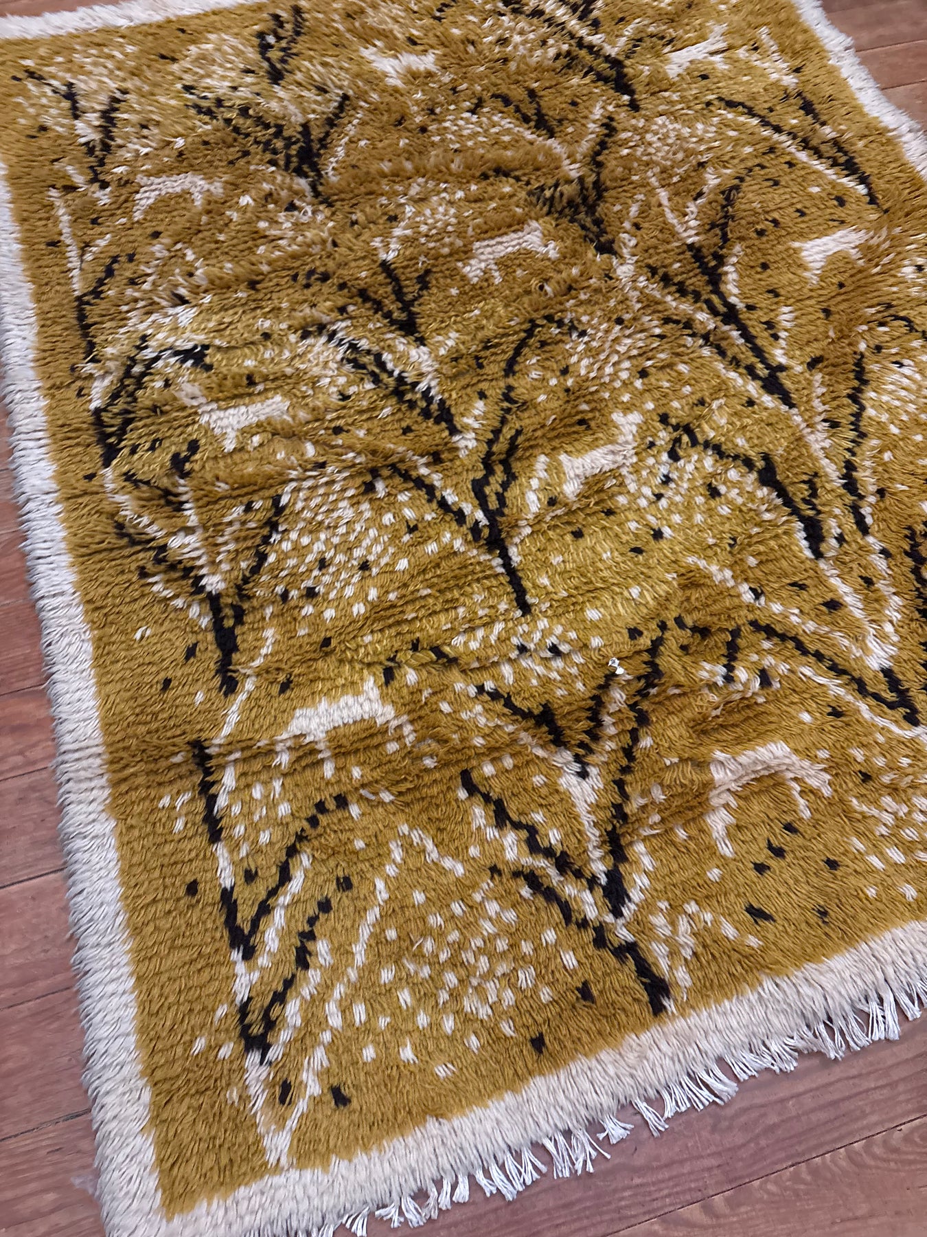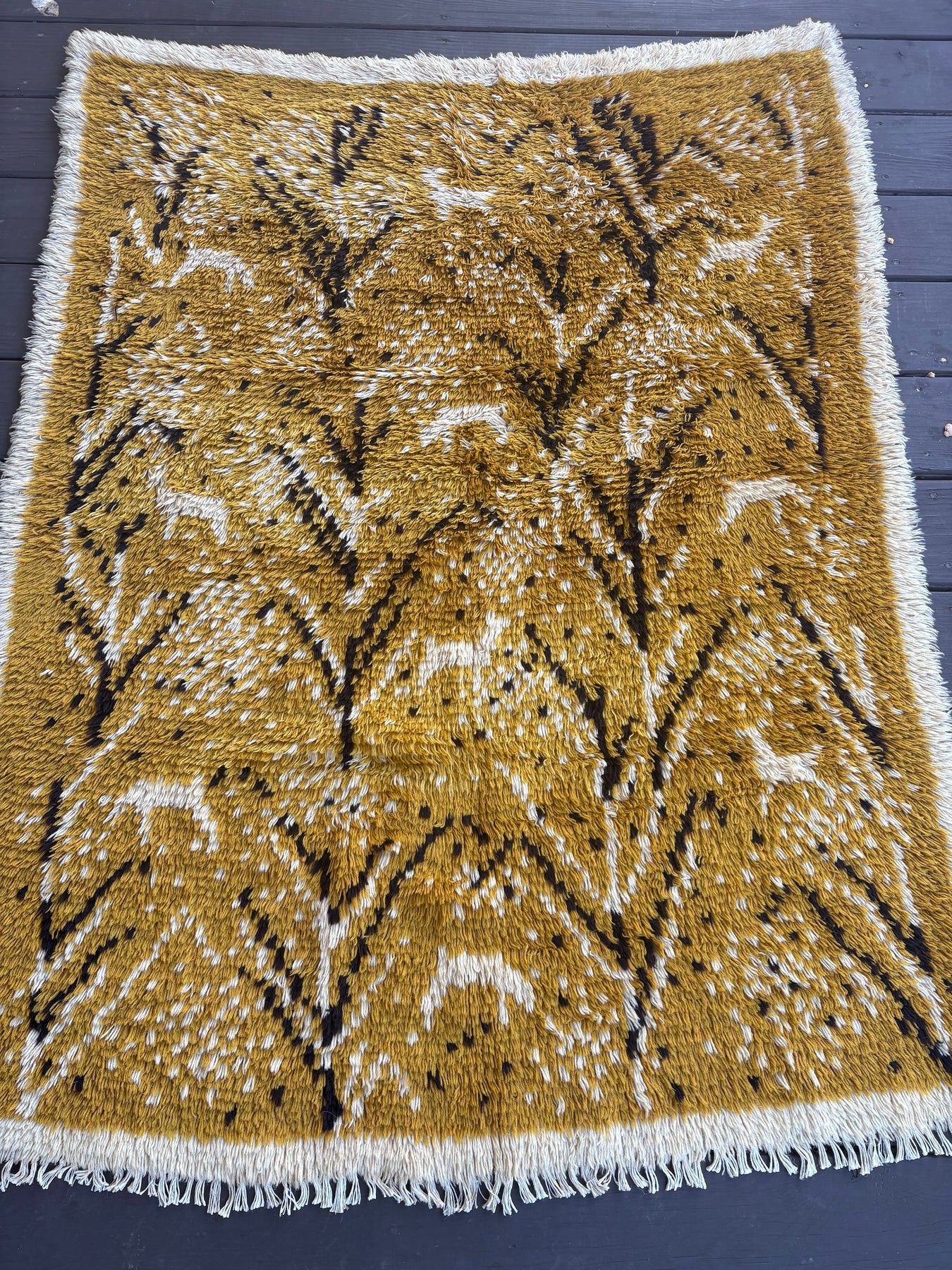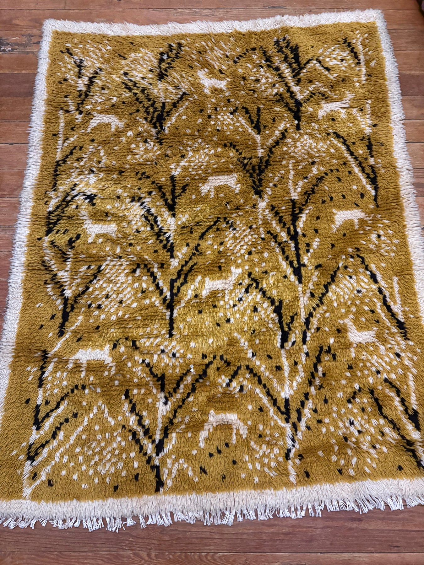 Bambi is a beautiful Moroccan rug and is hand knotted and woven from wool. She has a low pile, that is easy to clean up but is still soft underfoot. This rug measures approximately 3’4x4’7 at the widest bulge and has a very pretty palette of gold, camel with black and yellow accents. She carries a modern deer and wood design.