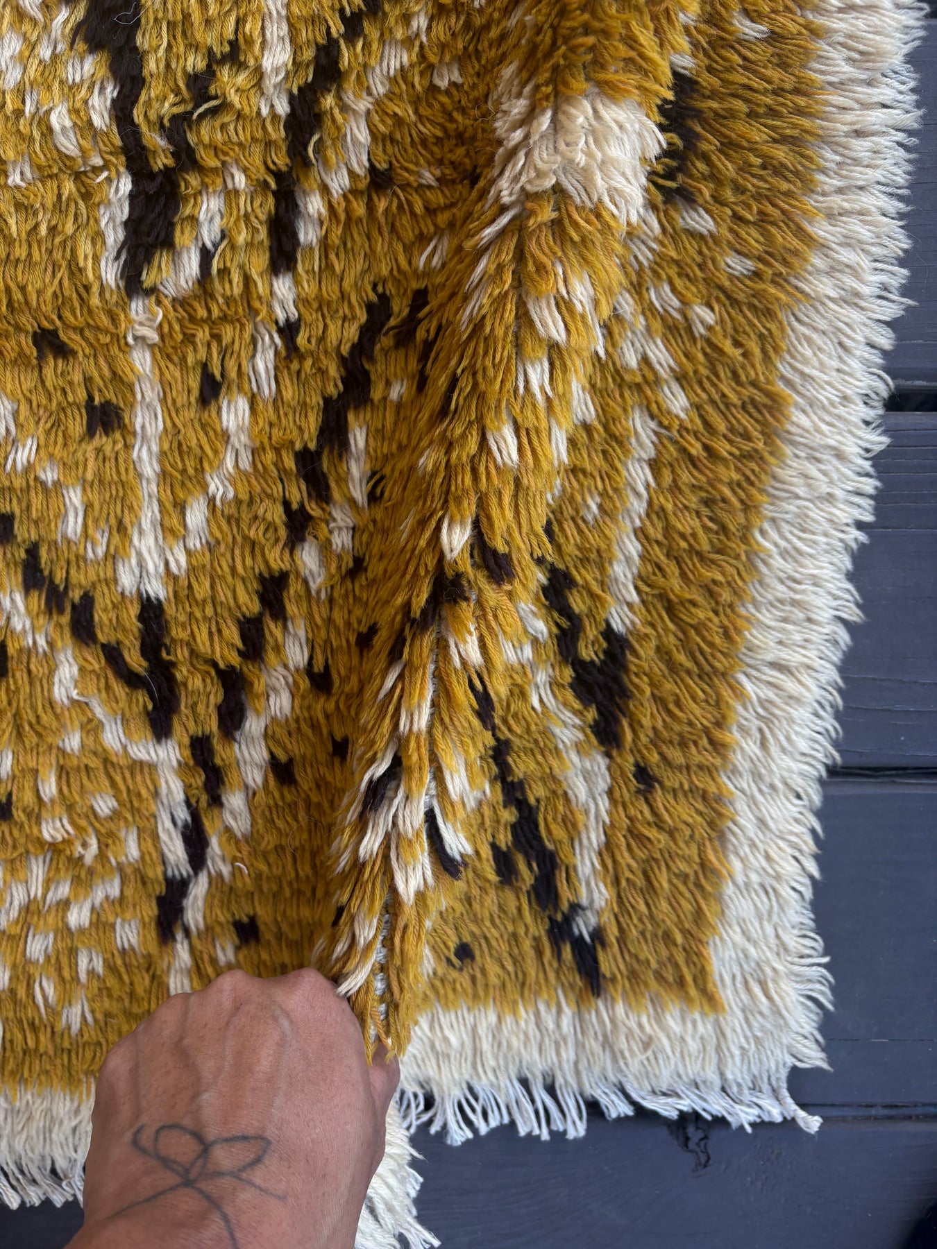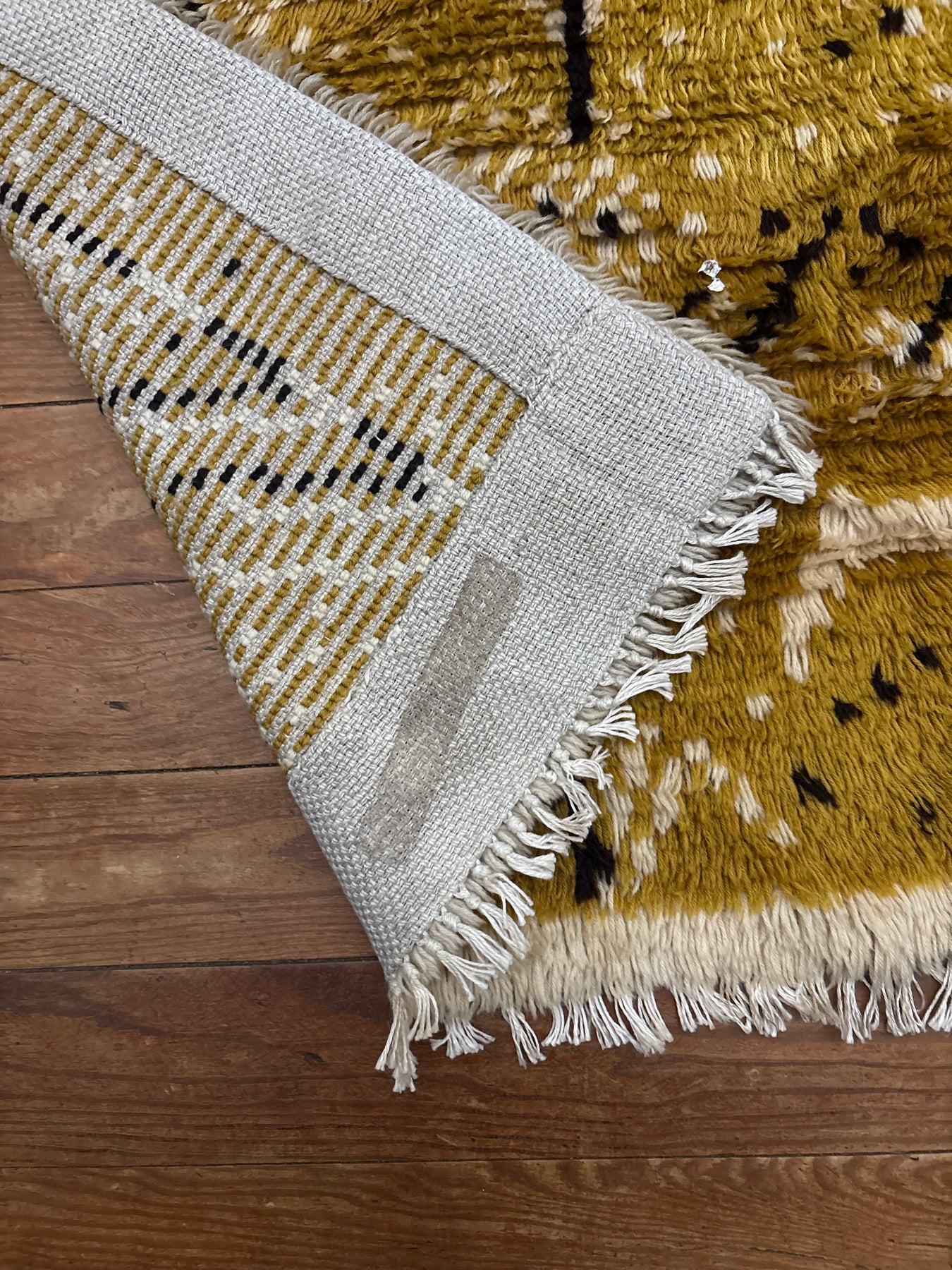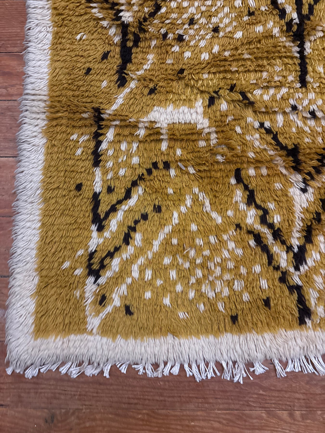 Bambi is a beautiful Moroccan rug and is hand knotted and woven from wool. She has a low pile, that is easy to clean up but is still soft underfoot. This rug measures approximately 3’4x4’7 at the widest bulge and has a very pretty palette of gold, camel with black and yellow accents. She carries a modern deer and wood design.