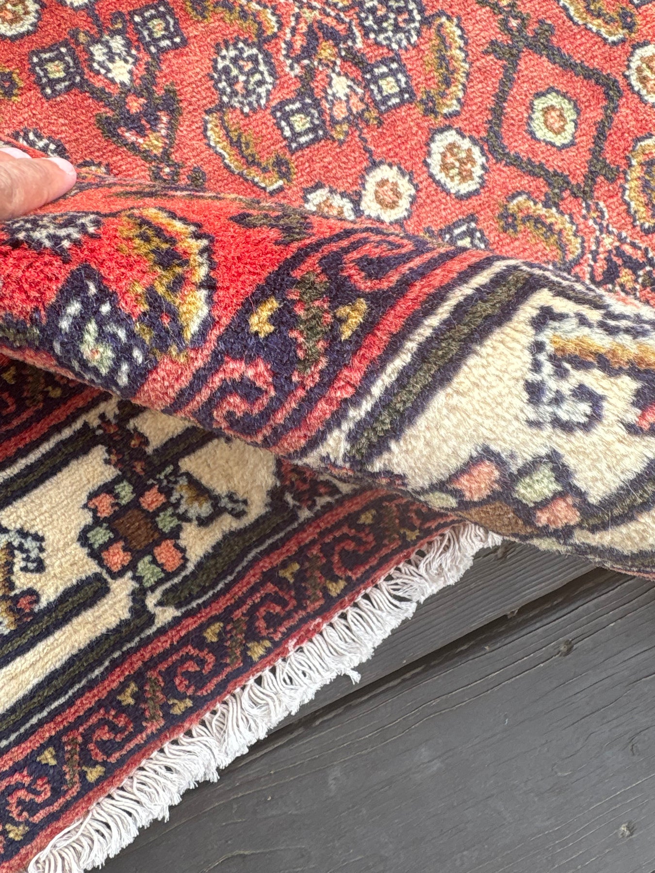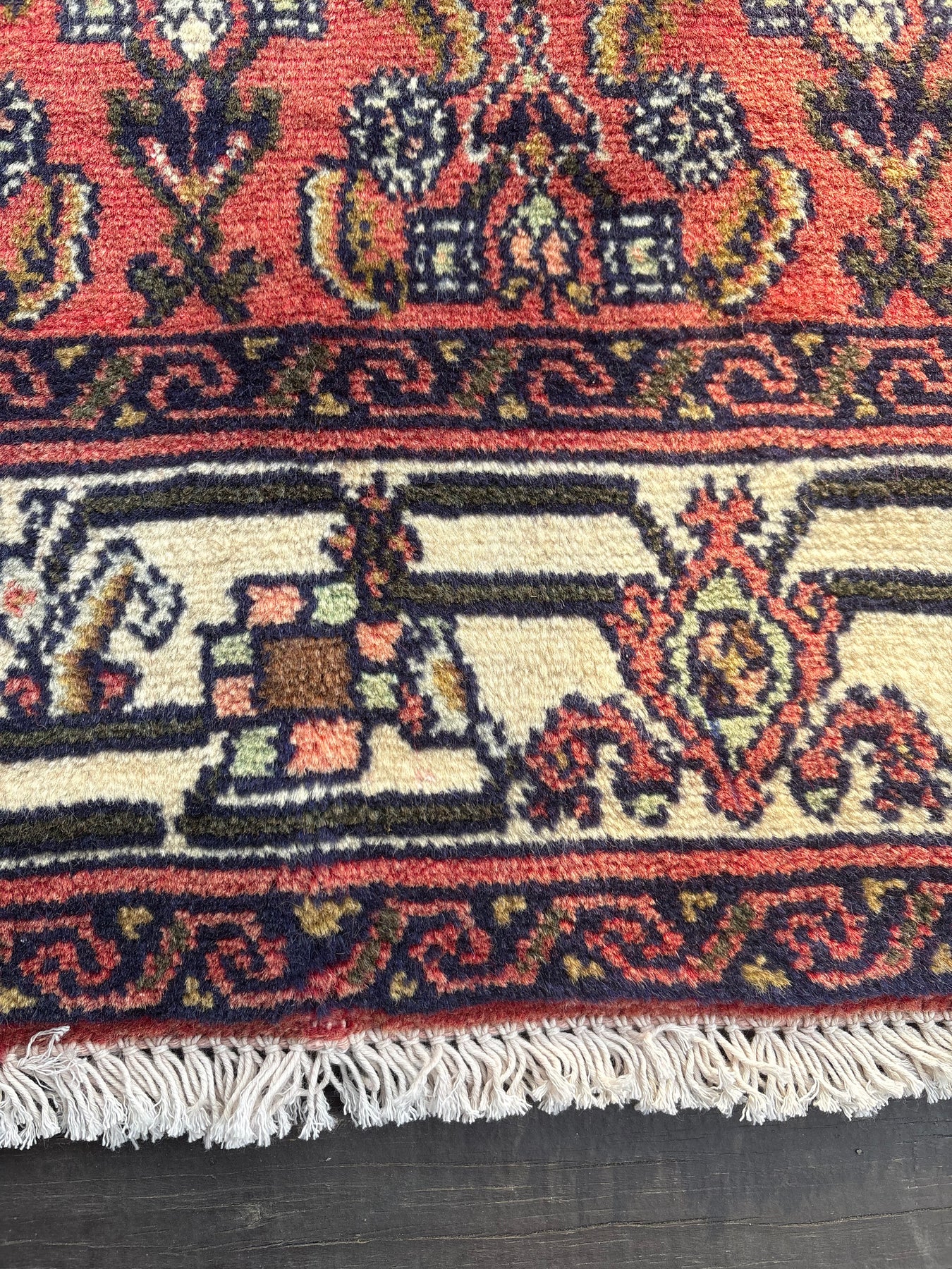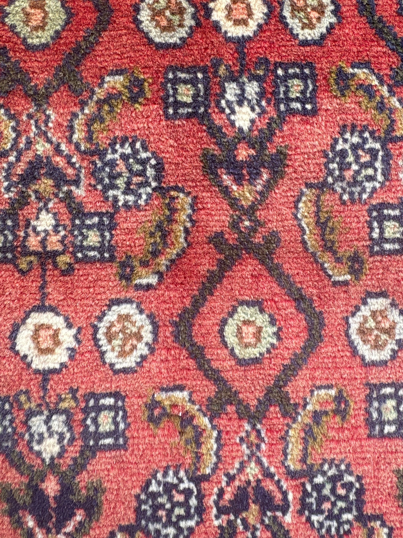 Florian is a beautiful oriental rug and is hand knotted and woven from wool. She has a low pile, that is easy to clean up but is still soft underfoot. This rug measures approximately 3’2x4’10 at the widest bulge and has a very pretty palette of pink, red with turquoise and coral accents. She carries the traditional diamond and four season design.