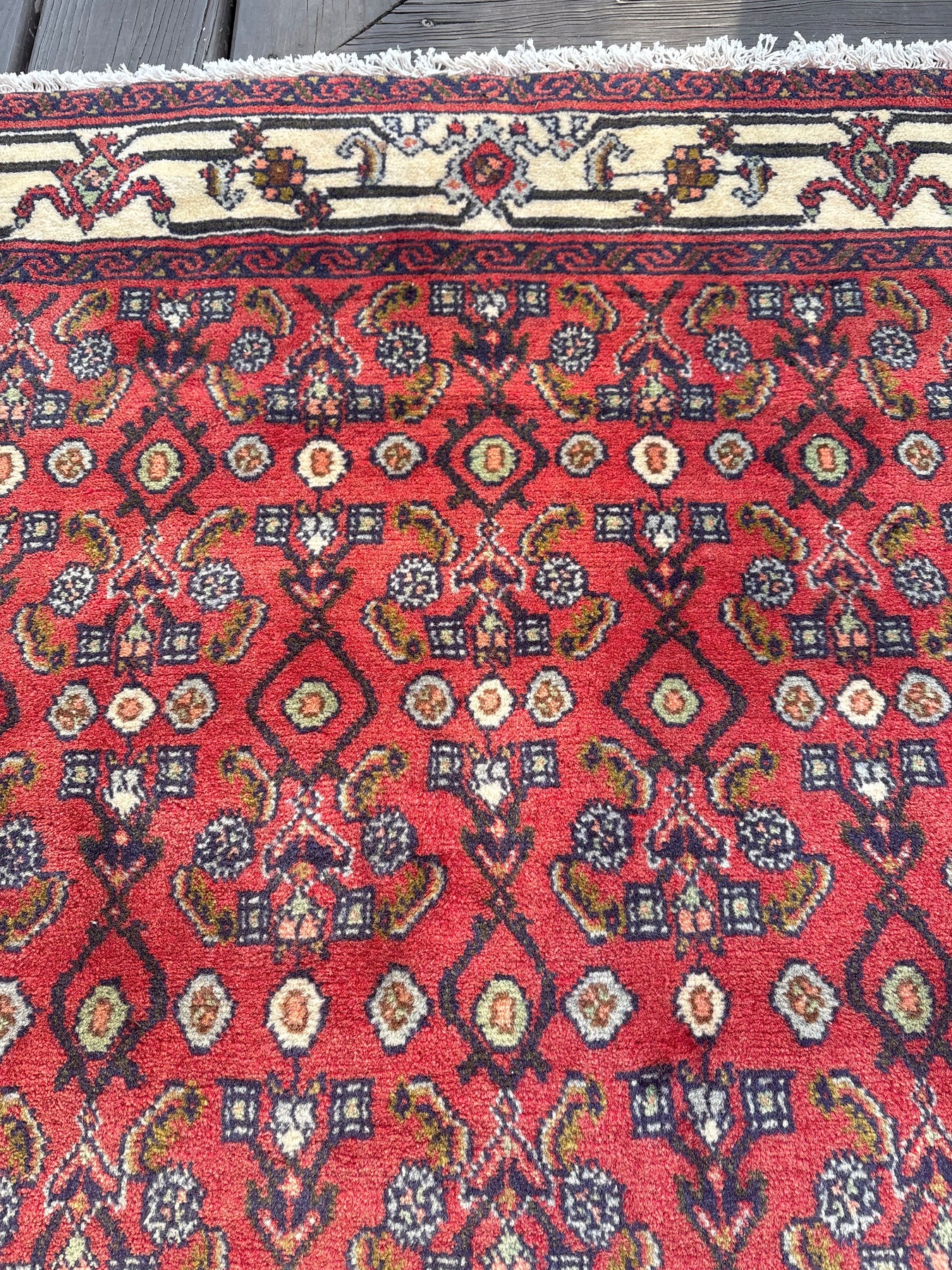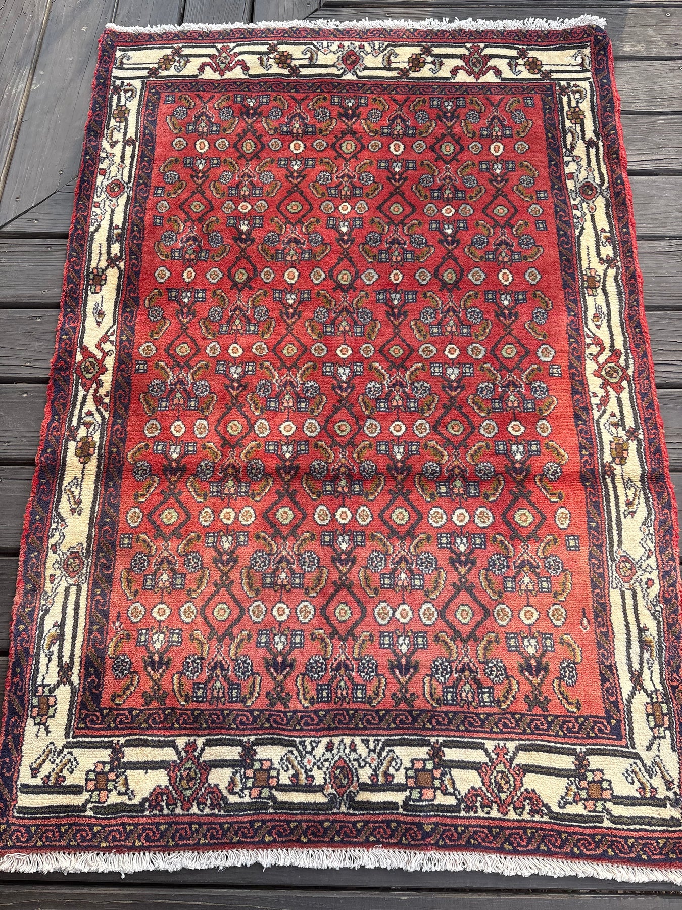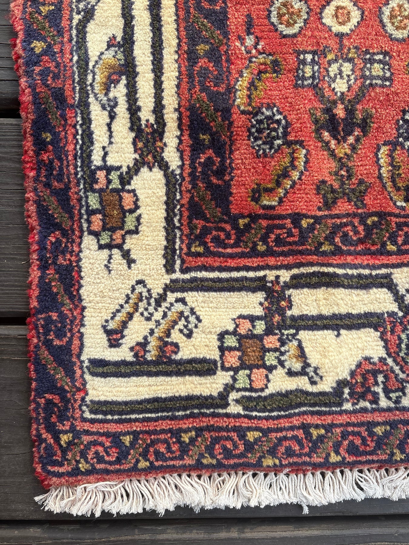 Florian is a beautiful oriental rug and is hand knotted and woven from wool. She has a low pile, that is easy to clean up but is still soft underfoot. This rug measures approximately 3’2x4’10 at the widest bulge and has a very pretty palette of pink, red with turquoise and coral accents. She carries the traditional diamond and four season design.