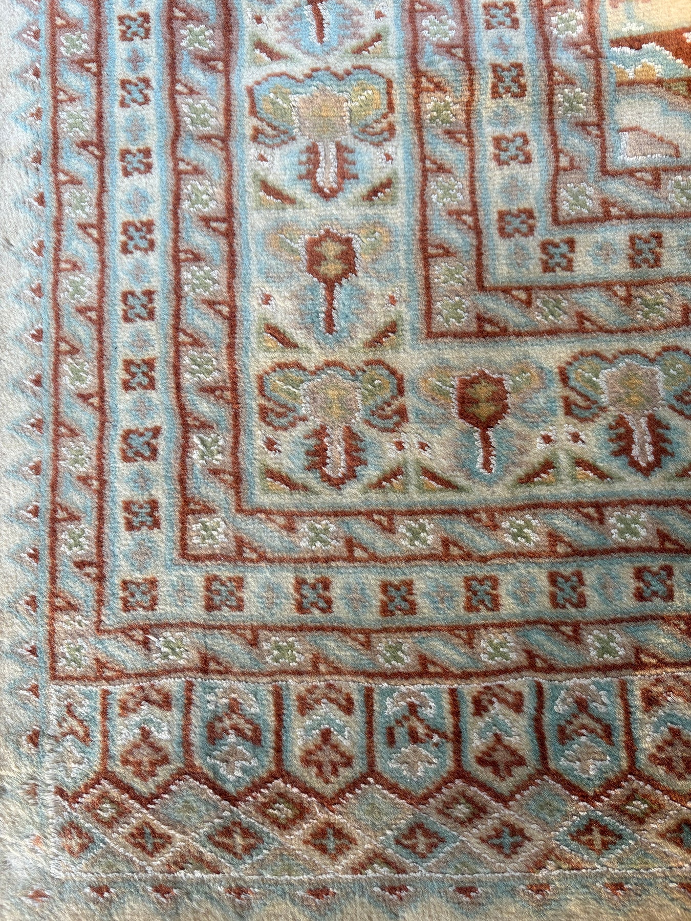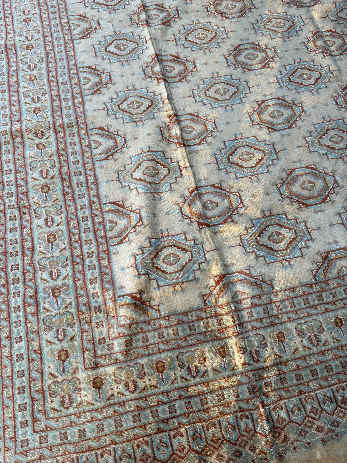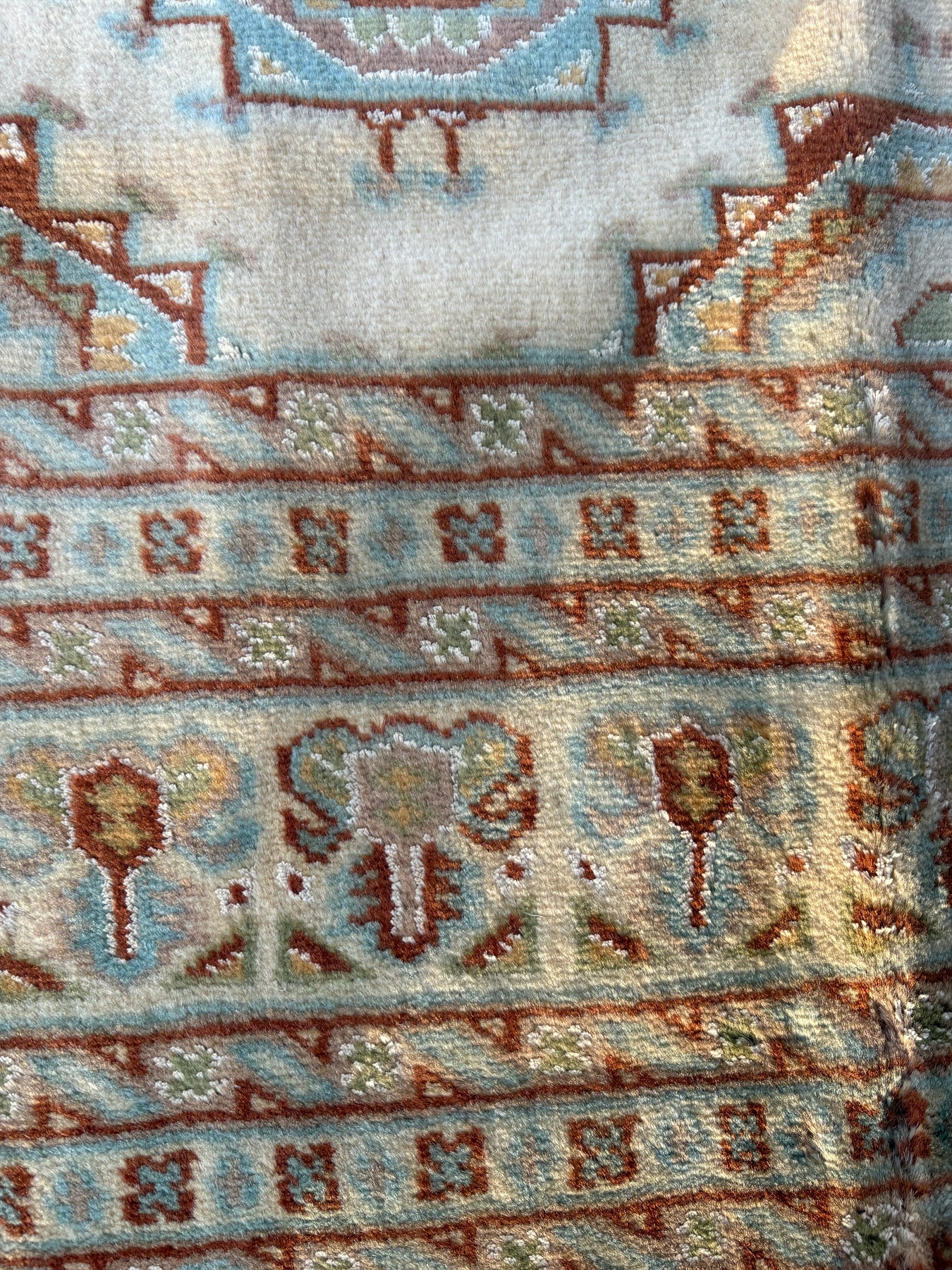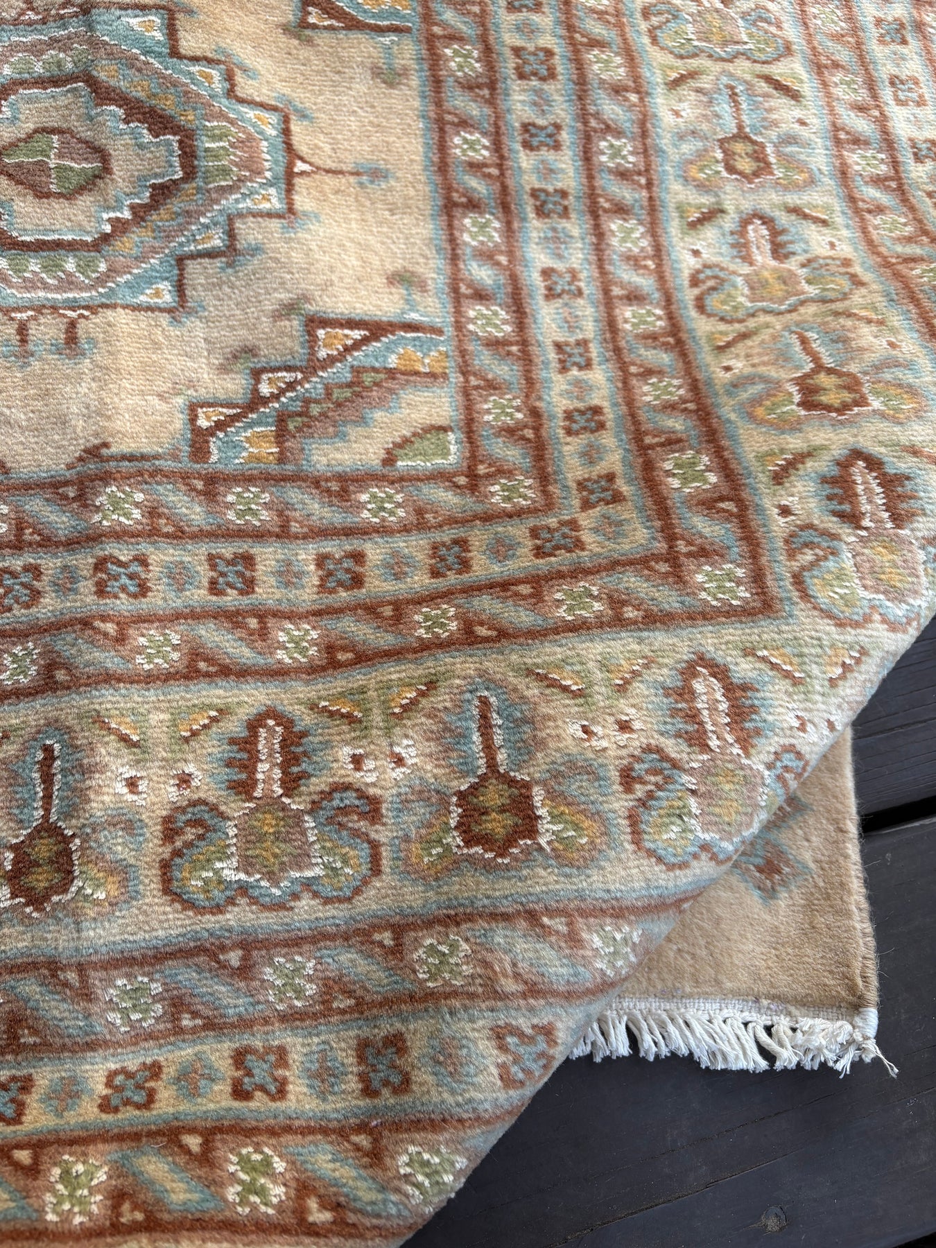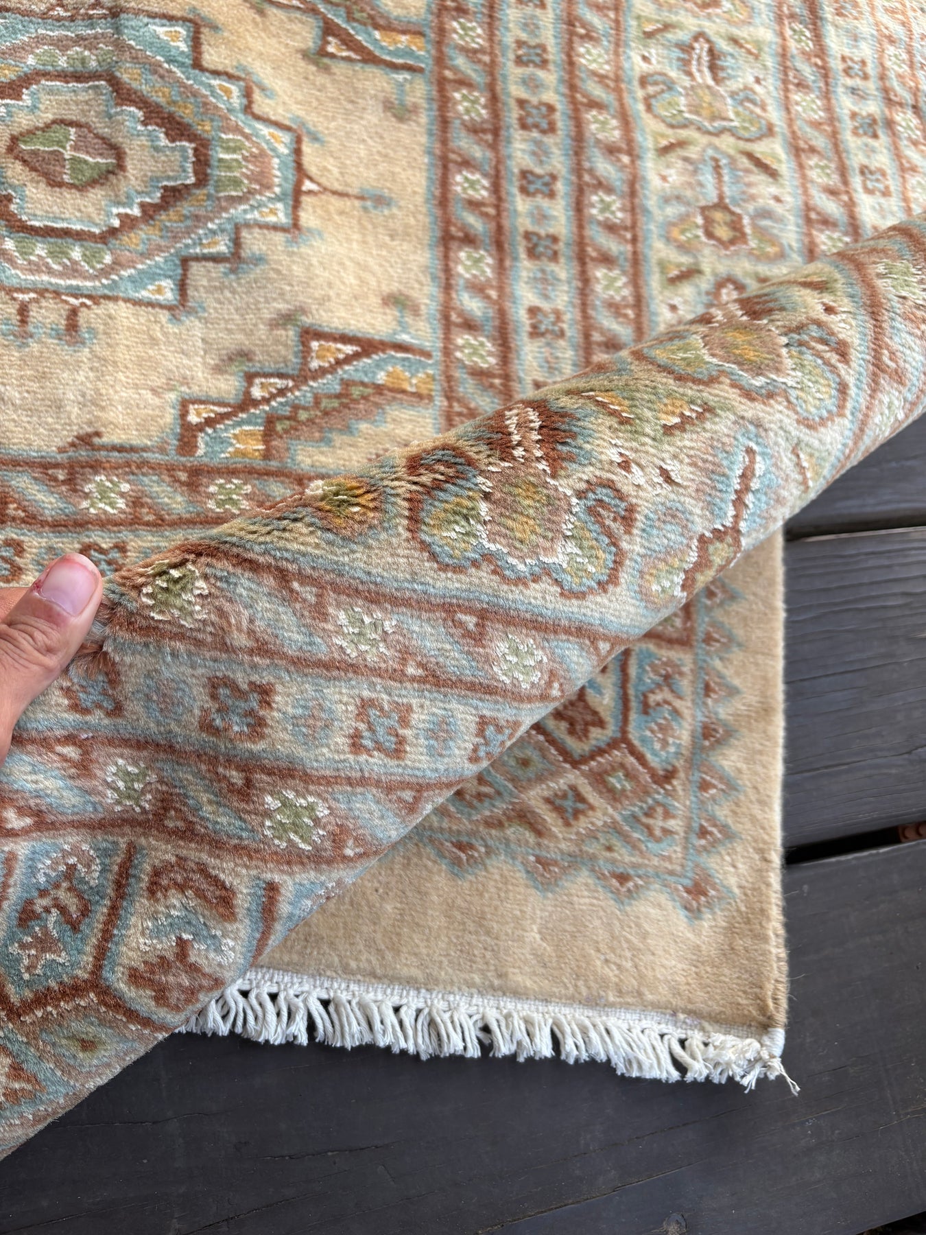 Magdalena is a beautiful bohkara rug and is hand knotted and woven from wool. She has a low pile, that is easy to clean up but is still soft underfoot. This rug measures approximately 6’5x10’3 at the widest bulge and has a very pretty palette of gold, light blue with green and orange accents. She carries the traditional diamond design and is buttery soft