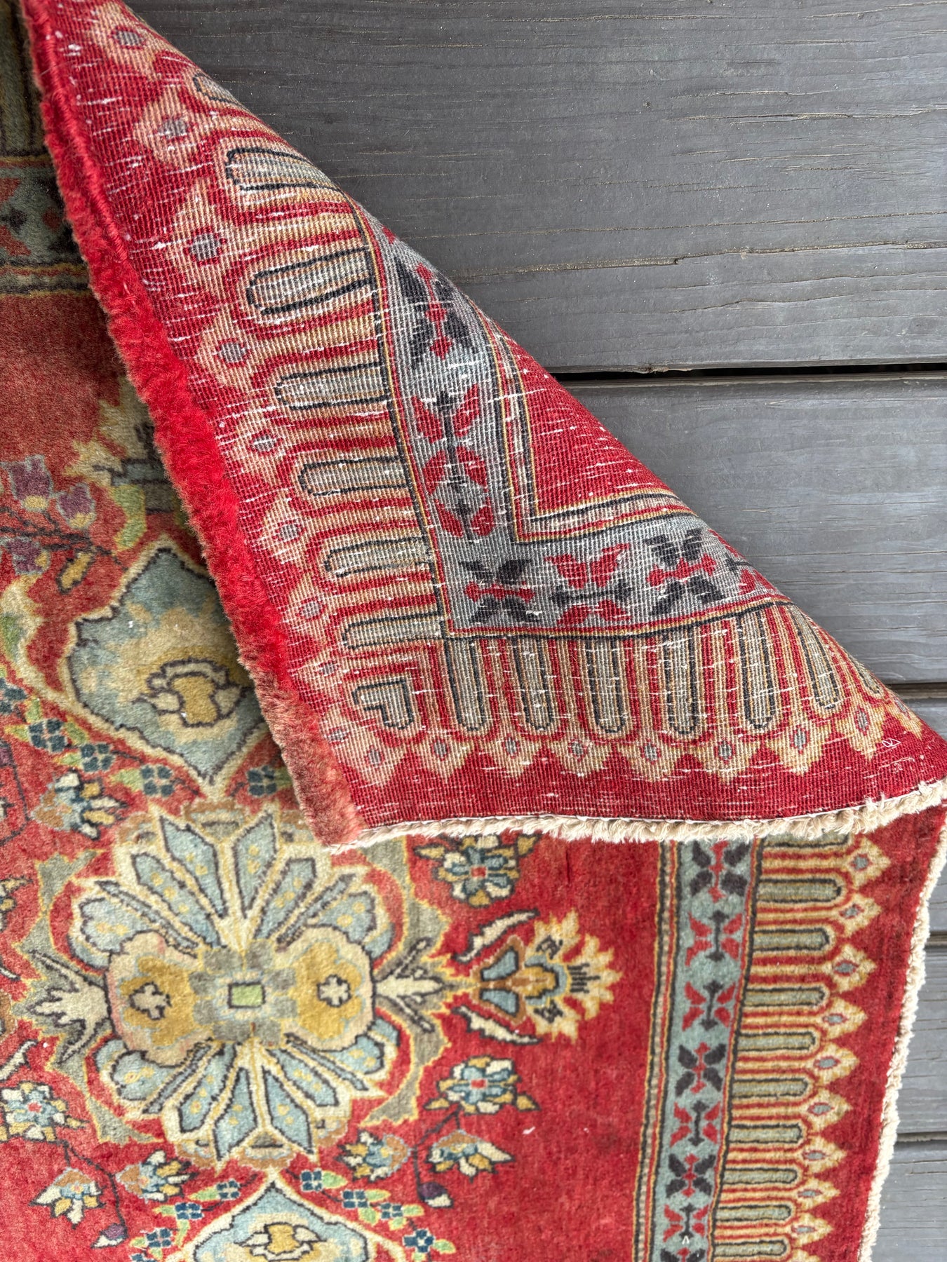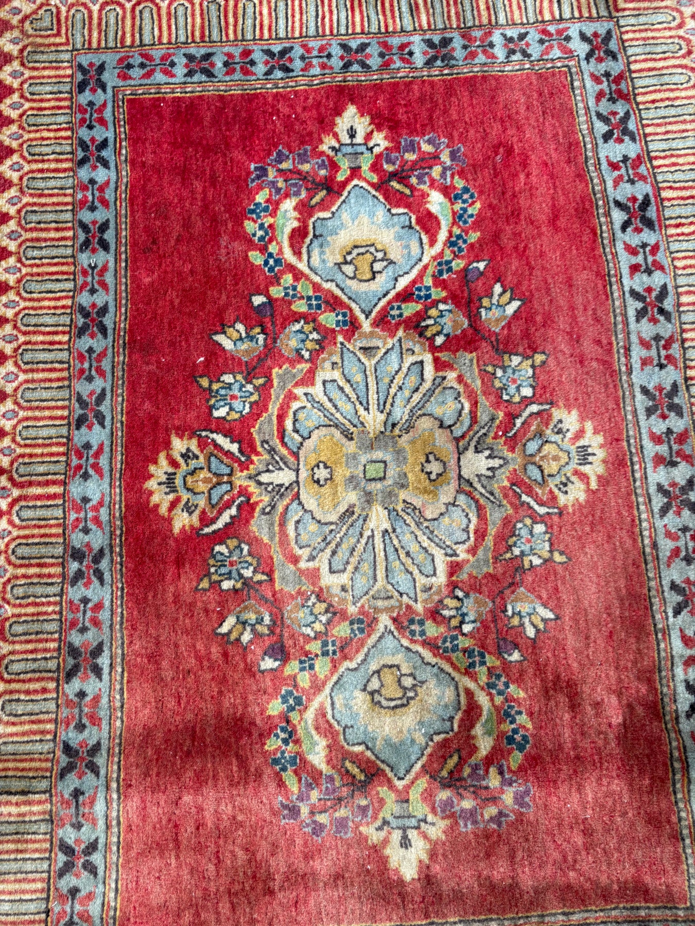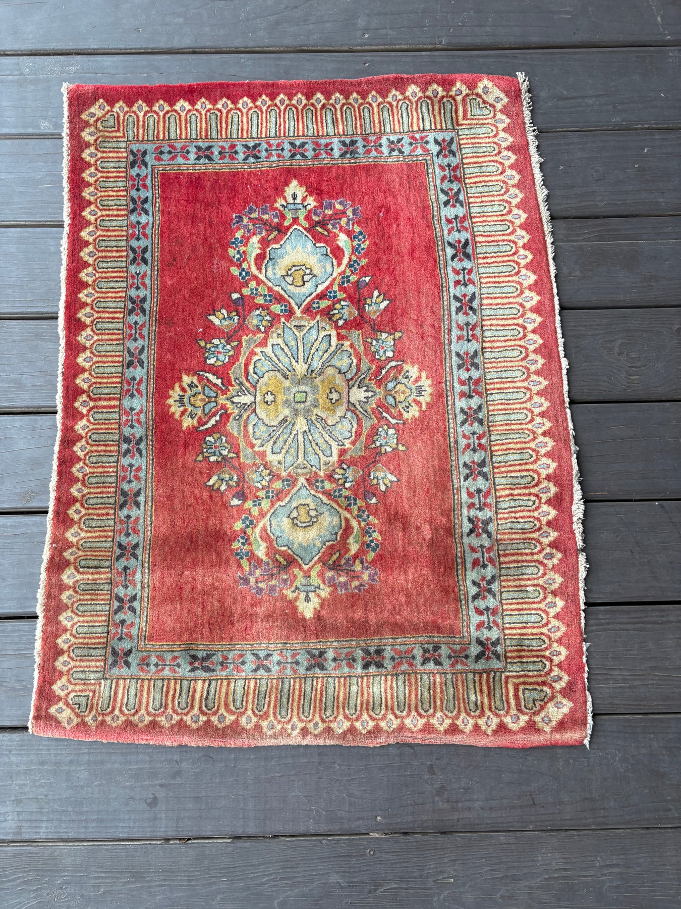 This rug is vintage. Please refer to photos for condition. We do our best to photograph these rugs in natural and artificial light but colors may appear different from what is shown on your screen. All of our rugs and pillows are vintage and/or antique. Due to their hand made nature and age, rugs may show discrepancies such as, repairs, tears, holes, wear, fading, discoloration, odor etc. We respect the character and history of our textiles, and do not consider these defects.
